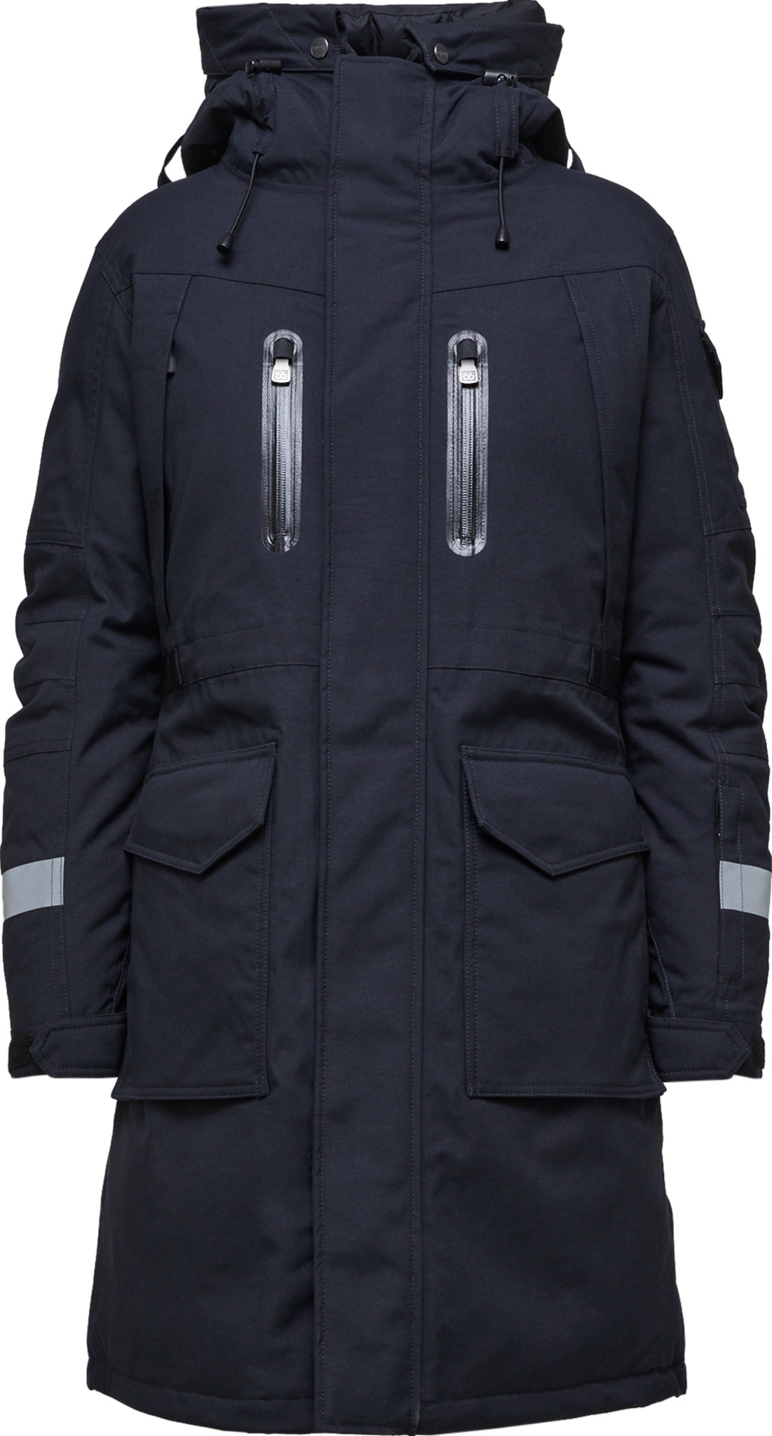 Jokla is a parka and a tool. The exterior of Jokla is made from a ruggedized Cordura nylon that was selected for its extreme durability and abrasion resistance. A water-repellent coating, taped seams, and coated chest zippers make Jokla waterproof. Finally, over a pound of premium 800-fill white goose down keeps out the cold. Reflective flashes, fifteen pockets, and a detachable 800-fill down hood trim provide further utility. 66°North is respected by guides, explorers, researchers, and film crews for making the world's best parkas. When Arctic photographer Benjamin Hardman must stand still for hours to get one perfect shot, he relies on his Jokla. Our down comes from a long-time German supplier, who has been certified in accordance with the Responsible Down Standard(RDS), and the Standard 100 by Oeko-Tex®. Jokla is cut to be worn with a mid-layer and fits all genders comfortably, using adjustments on the hood, waist, hem, and sleeves to customize wear. Those between sizes should size down.