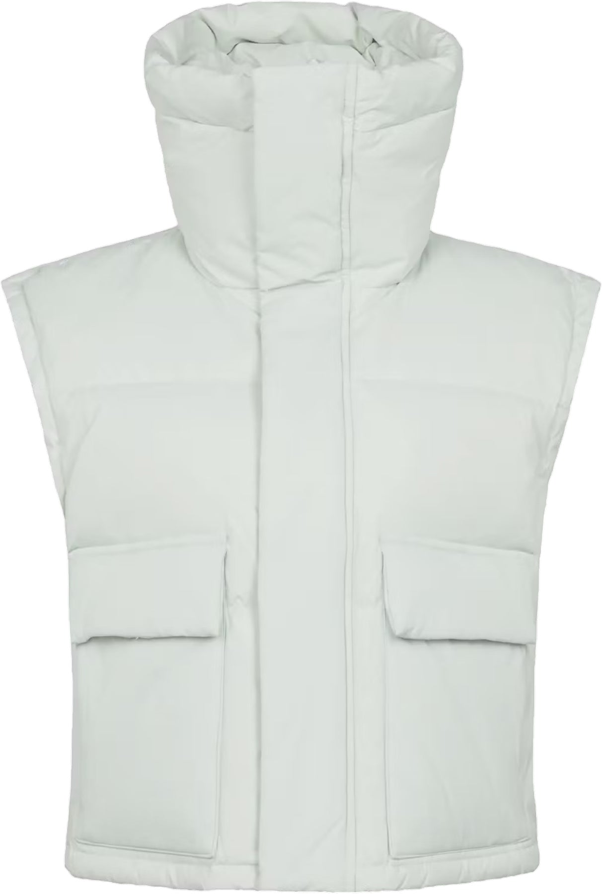 Striking in profile, the vest provides lightweight warmth with recycled down insulation with 700 fill power and water-repellent nylon with matte finish provides protection from wind and water. The outer shell is made from 100% recycled fibers, colored with natural dyes. It has two front pockets, an inside chest pocket and a high and protective collar with drawcord details at hem and the back.