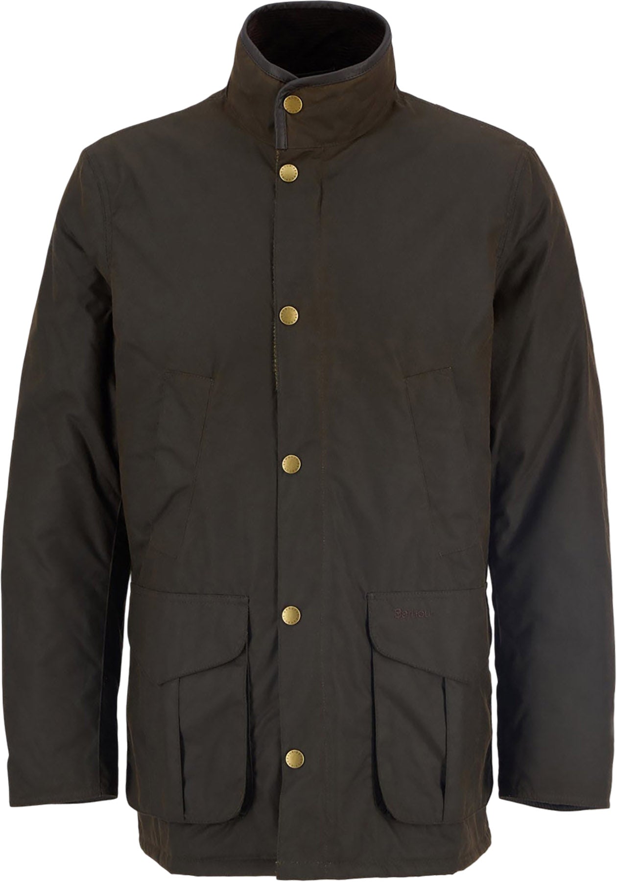 Waxed cotton jacket with leather trim. Features upper hand warmer pockets with moleskin pocket bags, lower studded patch pockets and heavyweight cord inner collar.