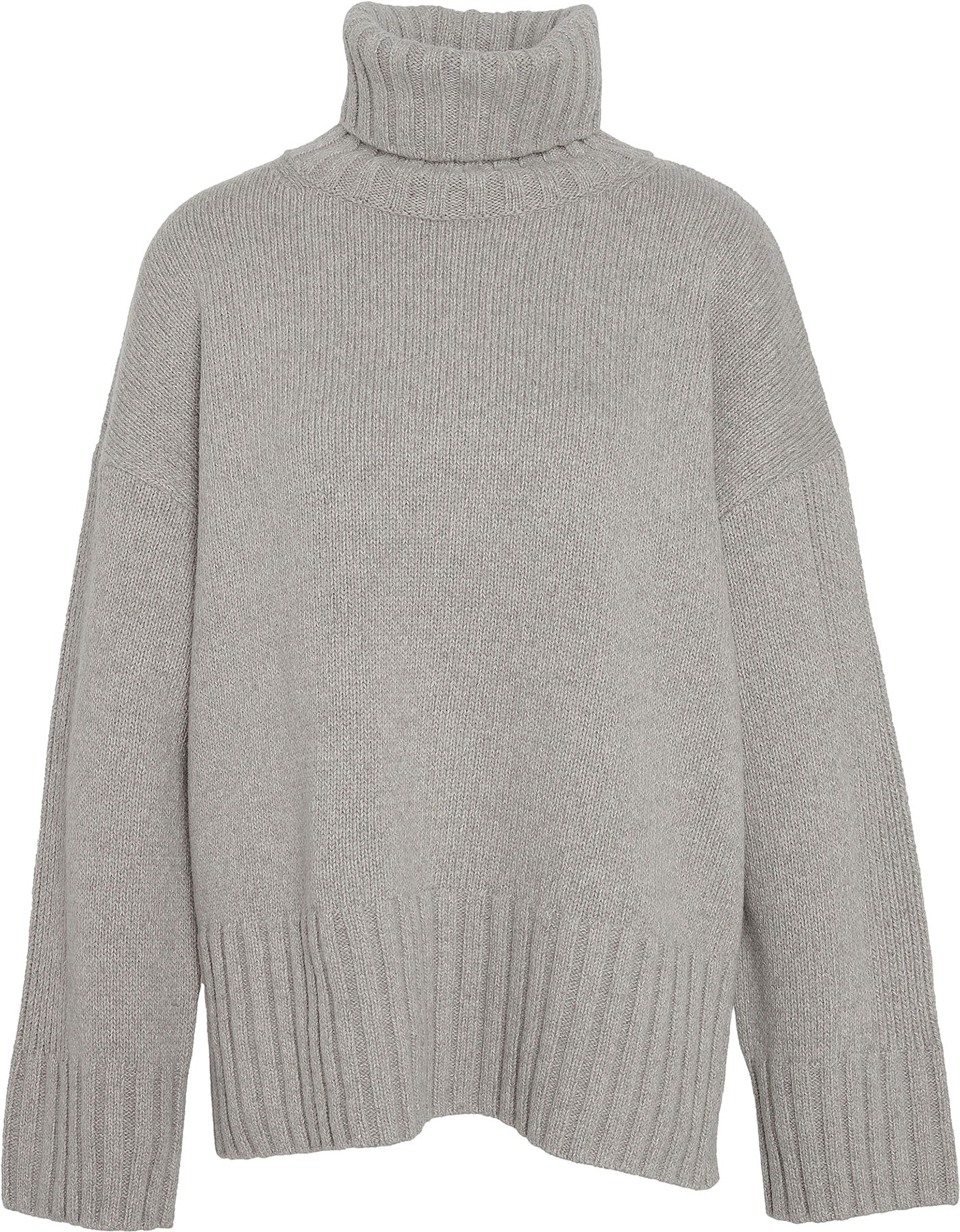 Chunky roll neck knit with drop shoulder and rib detail at sleeve overarm.