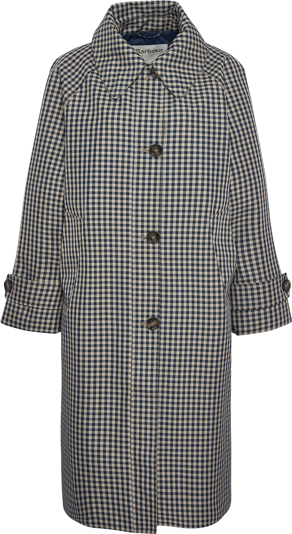 The Nadine Coat is a checked, relaxed A-line fit car coat style with mock horn button to the centre front and cuff tabs. Featuring a collar, welt pockets and tartan bias back neck buggy.