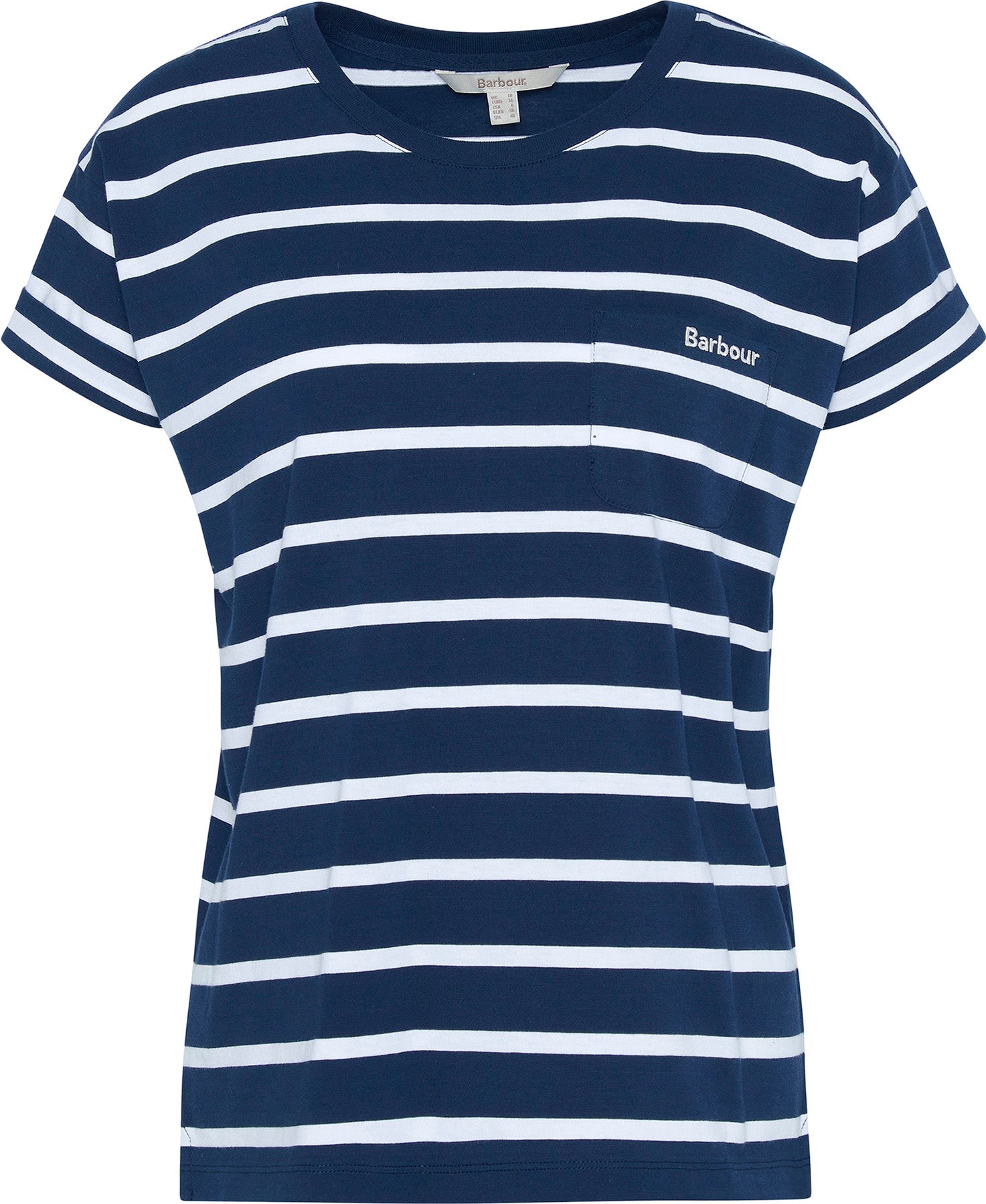 Short sleeve cotton t-shirt in an all over stripe design with turn up cuffs and contrasting Barbour block embroidery to left chest pocket.
