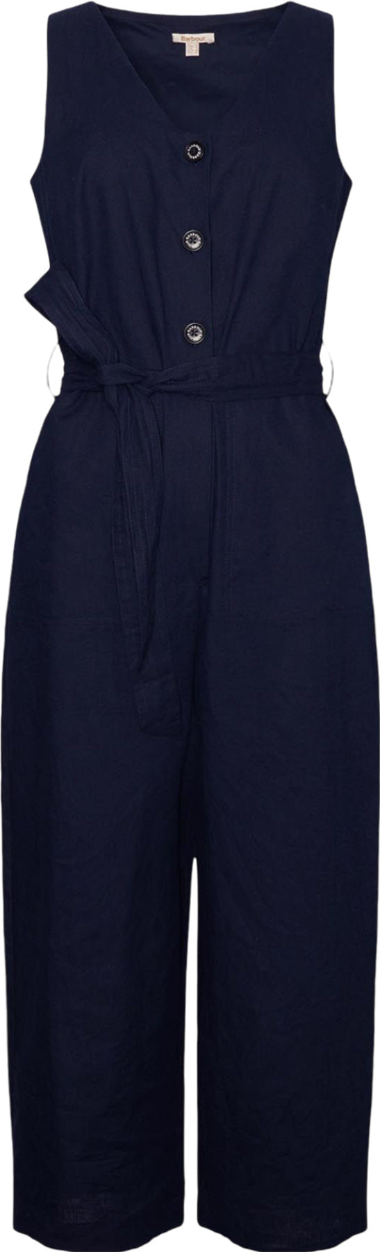 Cotton linen, black jumpsuit with stitched utility pockets, a stitch detail self fabric belt and mock horn feature button fastening.