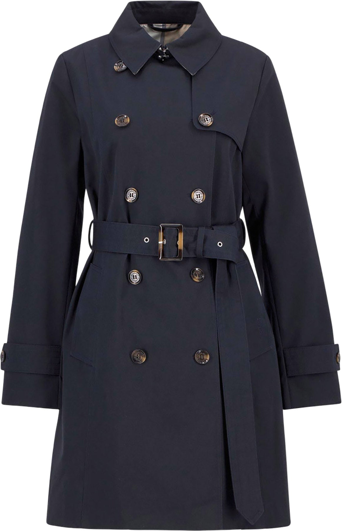 Classic double breasted trench. Tailored fit, mid length style with mock horn trims and lined in Rosewood tartan.
