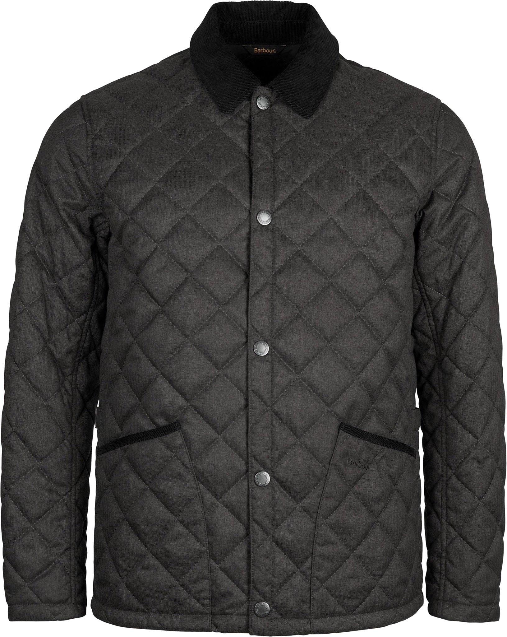 Box quilted jacket with stud front opening and sit down corduroy collar. This style features two front patch pockets with needlecord trim and stud fasten side adjusters.