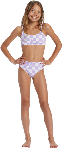 Featuring a checkered print with a touch of island flair, the girl's Check Your Palm Mini Crop Bikini Set is crafted from recycled polyester elastane blend fabric.