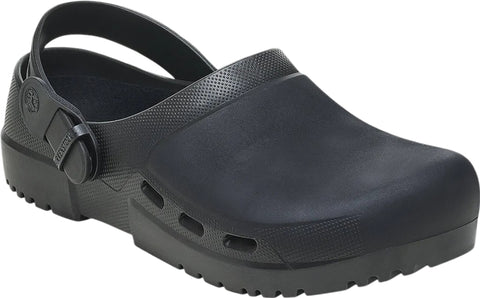 Features • Contoured PU footbed, antistatic • Fluid-resistant PU upper with side air vents • Microbfiber footbed lining • PU sole is antistatic, oil-and grease-resistant • Convertible backstrap, detergent-friendly buckle