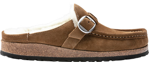 The Birkenstock Buckley is a semi-open moccasin-style clog that’s instantly recognizable as an authentic Birkenstock original thanks to its exposed cork footbed. Here, the classic model comes in a particularly cozy version with genuine shearling and a statement buckle. The perfect shoe for cozy winter evenings! The upper is made from soft suede leather.