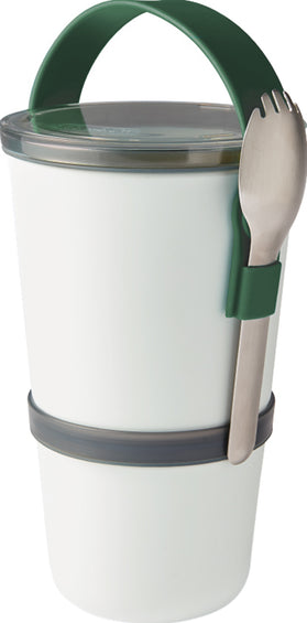 Features • 100% leakproof • Includes stainless-steel spork (spoon+fork) and carry handle • Microwave-safe (except for the lid), Dishwasher-safe and Freezer-safe • Compact storage + Minimal thread: The smaller lower pot fits inside the larger pot for compact storage or carrying after use. The minimal thread detail on the inside makes it nicer to eat from and easier to clean • Twist & Lock: The two pots simply twist and lock securely together, for easy separation and carrying • Volume measurements: Inside the big pot you will find ml and fl oz markings that make it easy to measure liquid ingredients