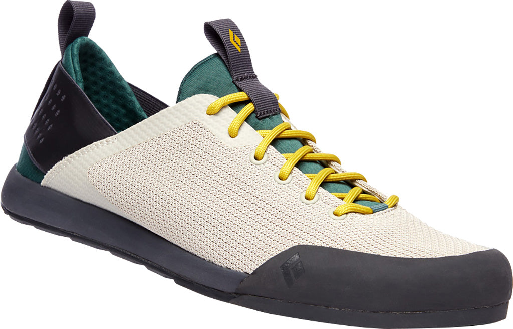 • Engineered to send in style, the Black Diamond Session combines ultimate comfort with performance features that seamlessly transitions from the gym to the crag and then out to the city streets. You’ll first notice how the shoe slips on thanks to the stretch-fit heel for easy on/off transitions. That heel also folds down with ease for slip on functionality. Then the integrated bootie wraps your foot like a sock, while the breathable knit upper regulates the temperature and stretches where you need while on the move. The tuned EVA midsole keeps you cushioned and stable, while the Black Diamond BlackLabel-Street sticky rubber adds grip for approaches or commutes. Finally, webbing loops provide tagging or stowing options for trails that end at the cliff.