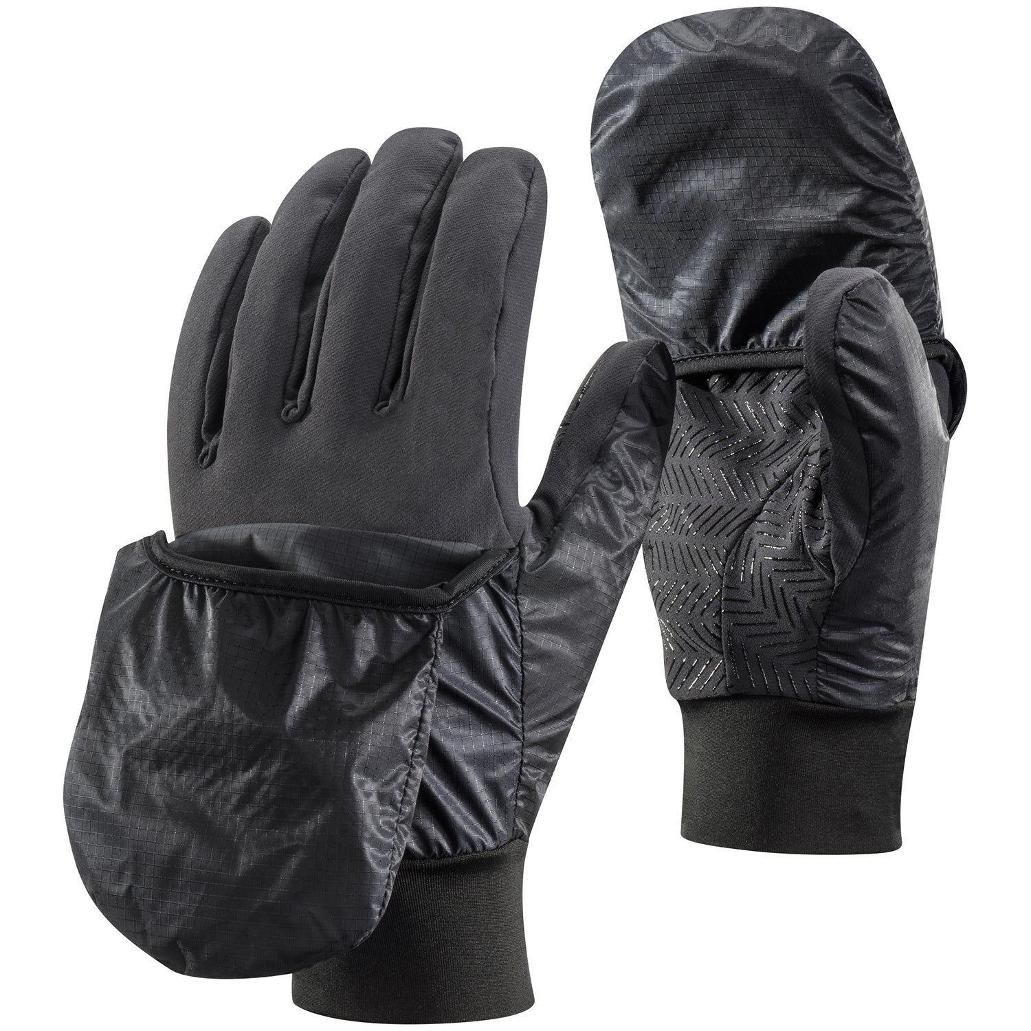 For ski touring, ultra running and other aerobic alpine pursuits through variable terrain and changing conditions, the Black Diamond Wind Hood Softshell Gloves combine a stretchy, highly breathable softshell glove with a stowable, weather-resistant flap hood that quickly deploys when the weather turns south. The mitt-style Pertex® Endurance wind hood is fixed on the thumb and easily rolls up and hides away in mild weather. PrimaLoft® Gold insulation helps combat chilly alpine temps, and the patterned grip palm provides a firm grasp on poles and other essentials.