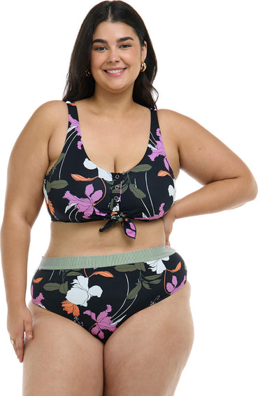 Dreamy is a reversible masterpiece blending the elegance of black with lilac, orange, and white florals. Versatility meets sophistication in this enchanting design, offering two distinct looks in one. Embrace the allure of timeless chic or the whimsy of vibrant blooms, effortlessly transitioning between moods with every wear. Best of all, it's made with recycled fabric! Kate is like your favorite comfy tee, repackaged as a super-cute swim top. This tank-style piece features playful accents like buttons, and a trendy tie on the front, plus removable soft cups and a built-in shelf bra so you can customize your fit.