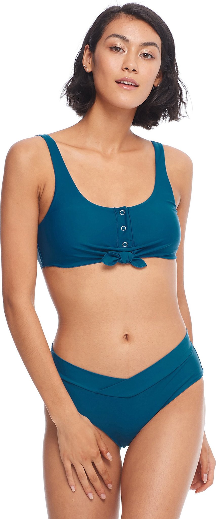 Kate is like your favorite comfy tee, repackaged as a super-cute swim top. This tank-style piece features playful accents like buttons and a trendy tie on the front, plus removable soft cups and a built-in shelf bra so you can customize your fit. Pair Kate with any of the matching smoothie bottoms.