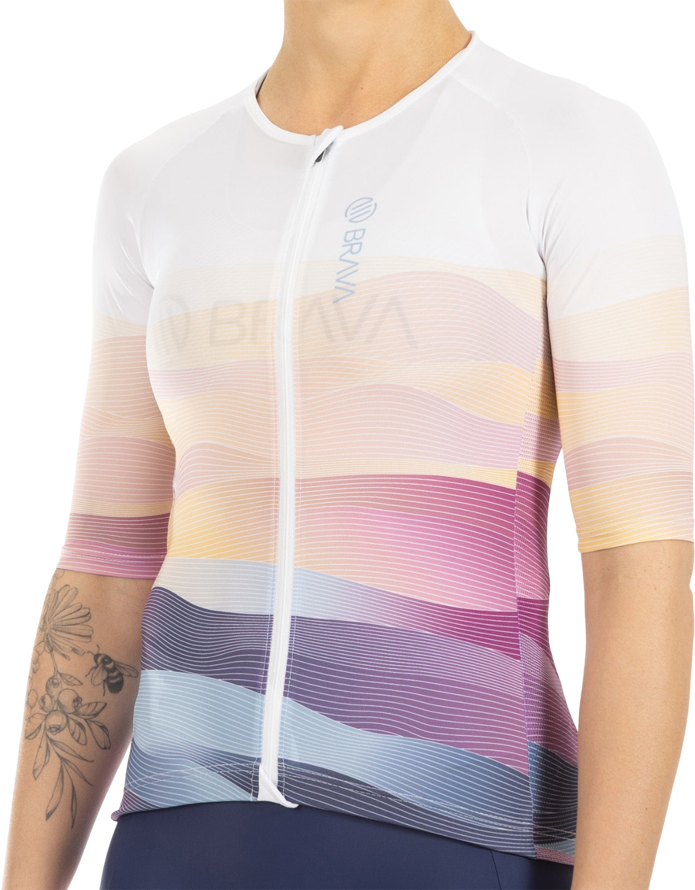 New for 2025! The Brava triathlon jersey is thin, lightweight, and quick-drying. This tri-specific performance wear is comfortable, offers a modern cut, and UFP 50+ sun protection. The best endurance sportswear made for women.