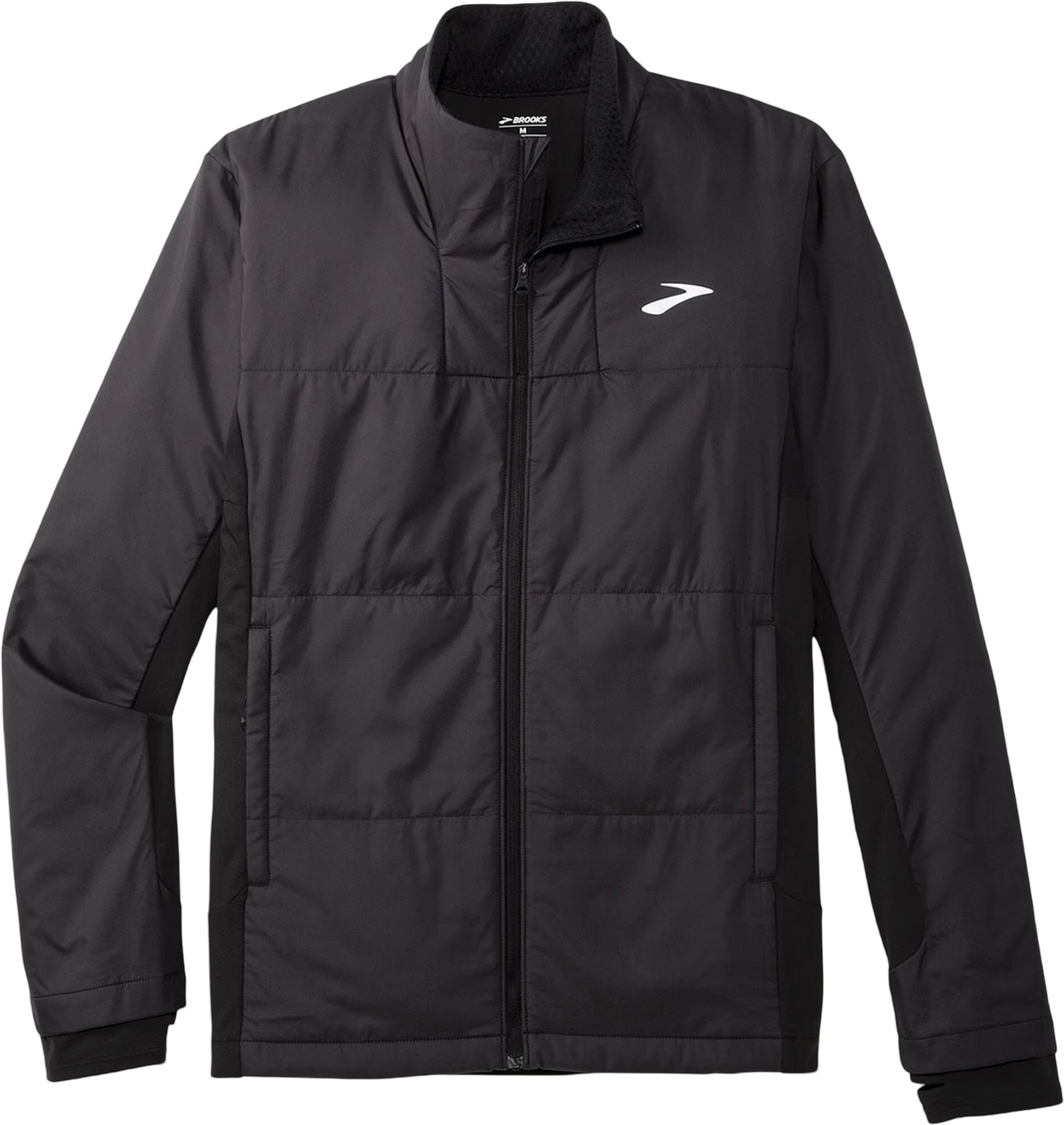 A men's jacket designed for running in cold, wet weather, the Shield Hybrid Jacket 3.0 features windproof, water-repellent protection. The lightweight 80g Thermolite® insulation provides warmth, while fitted cuffs and a tall collar help hold that warmth close.