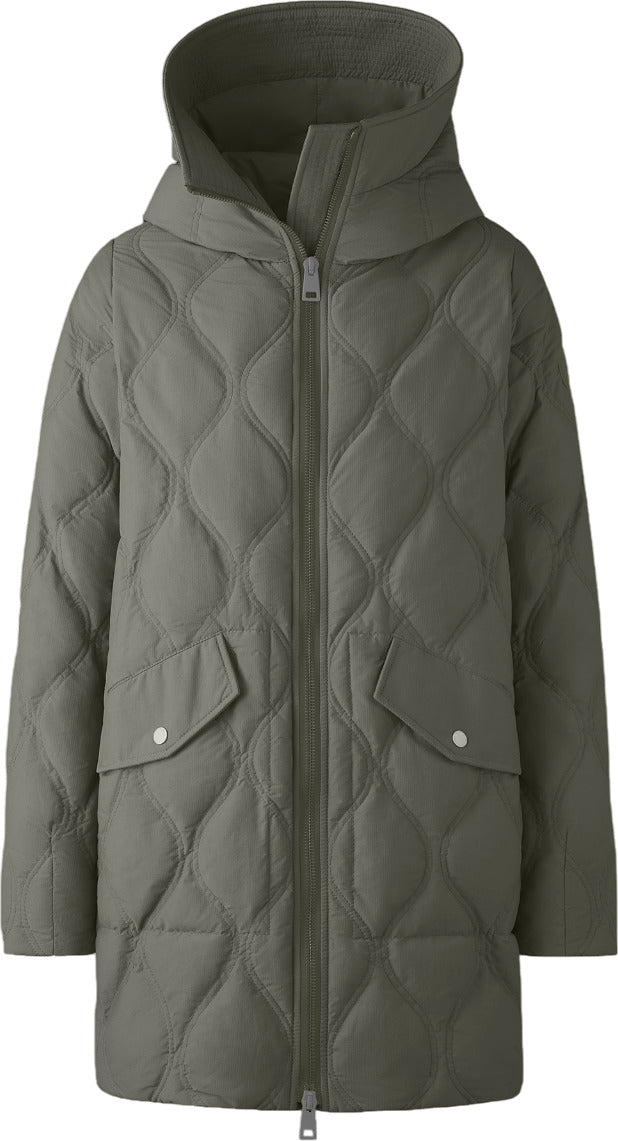 The Alessia Coat is crafted from Cotton Nylon Mini-Ripstop, a matte-finish fabric made with recycled nylon and organic cotton. It features heritage-inspired double-needle quilting, a snorkel hood, and dart seams at the hem and sleeves for shaping.