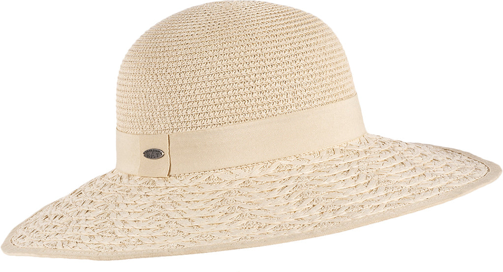 The rounded crown is highlighted by a tone-on-tone gros-grain ribbon, while matching piping defines the hat’s fancily woven large brim. The Carlinia revisits the bohemian look with a tad of chic.