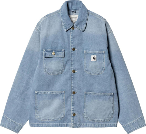 The Women's OG Michigan Coat is made of 11.25oz Norco denim, which is a robust cotton fabric. The unlined garment is inspired by a classic chore coat silhouette and has been cut in our original loose fit. Four front patch pockets offer a utilitarian touch, while triple stitch details provide extra durability. A Square Label on the chest pocket completes the design.