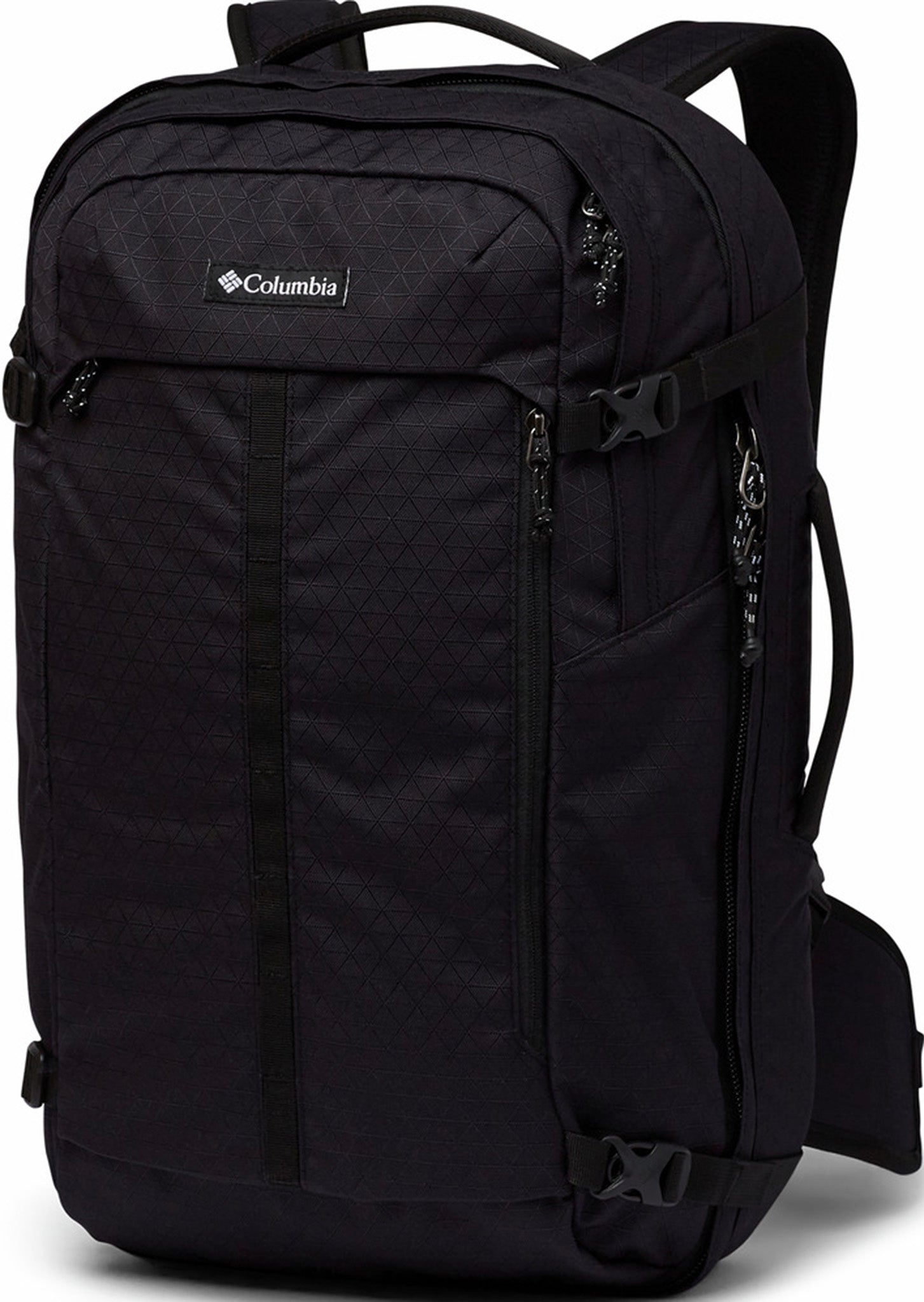 Features • Legal carry on size with most airlines • Clamshell opening • External access to padded laptop sleeve • Separate tablet sleeve • Side compression straps • Front pocket organization • Main compartment with internal compression • Water bottle pocket • Zippered internal shoe and mesh pockets • Contoured shoulder straps • Pass through sleeve for luggage attachment • Stowable shoulder strap and hip belt system • Fleece-lined sunglass pocket • Two padded haul handles