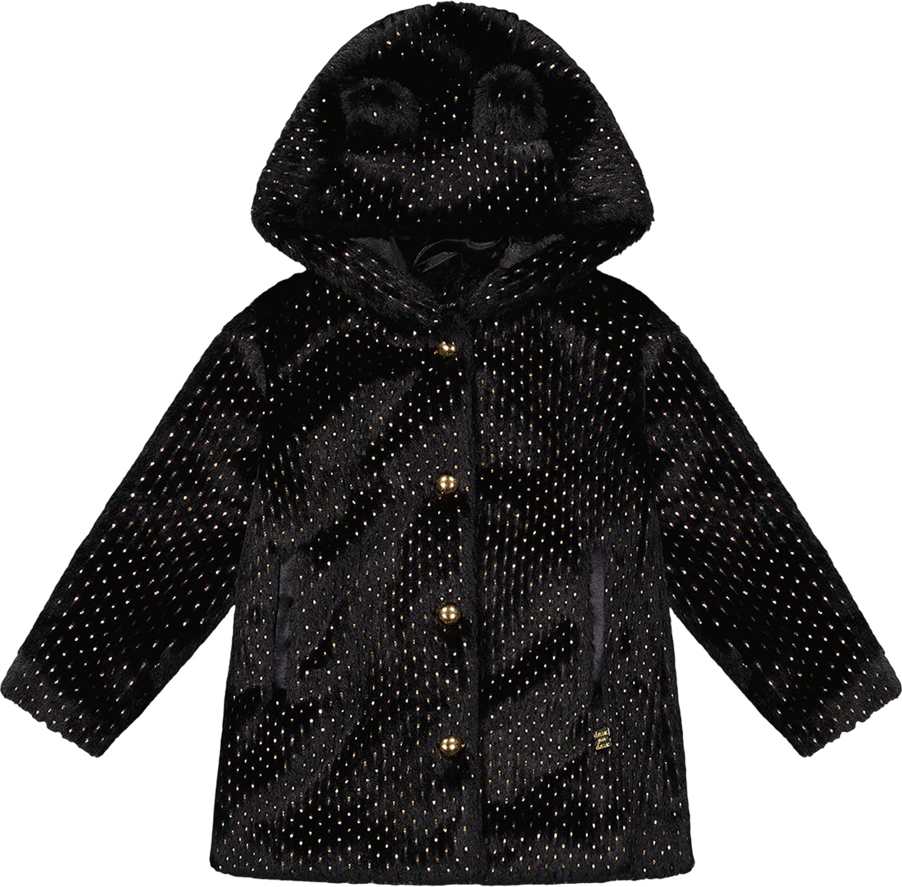 Our Bear Faux Fur Coat Black With Gold Polka Dots adds a playful and cozy touch to her winter wardrobe. This adorable coat is made from ultra-soft faux fur with a dotted gold foil pattern, a button-up front, and a hood with 3D bear ears for added charm. Fully lined for warmth, it’s the perfect outerwear for chilly days and festive strolls.