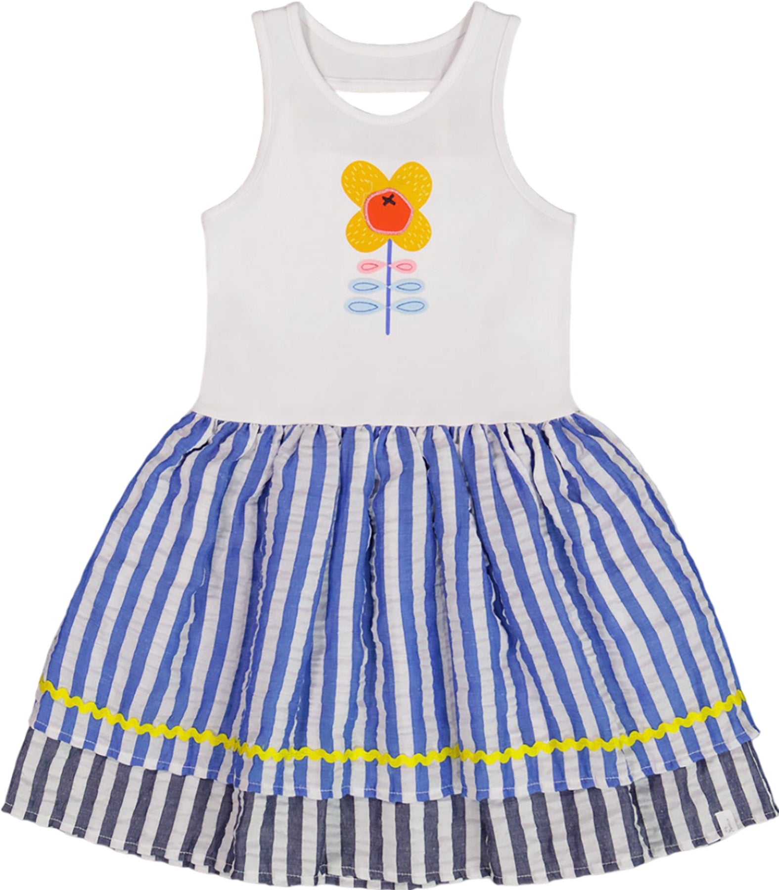 A back cutout and a graphic print on the chest make our Bi-Material Cotton and Seersucker Dress White and Royal Blue simply adorable from every point of view! This dress features a sleeveless cotton bodice with wide straps, a scoop neckline, and a flower print. The skirt features a flared silhouette with a contrast striped hem and yellow ricrac trim for an added pop of color.