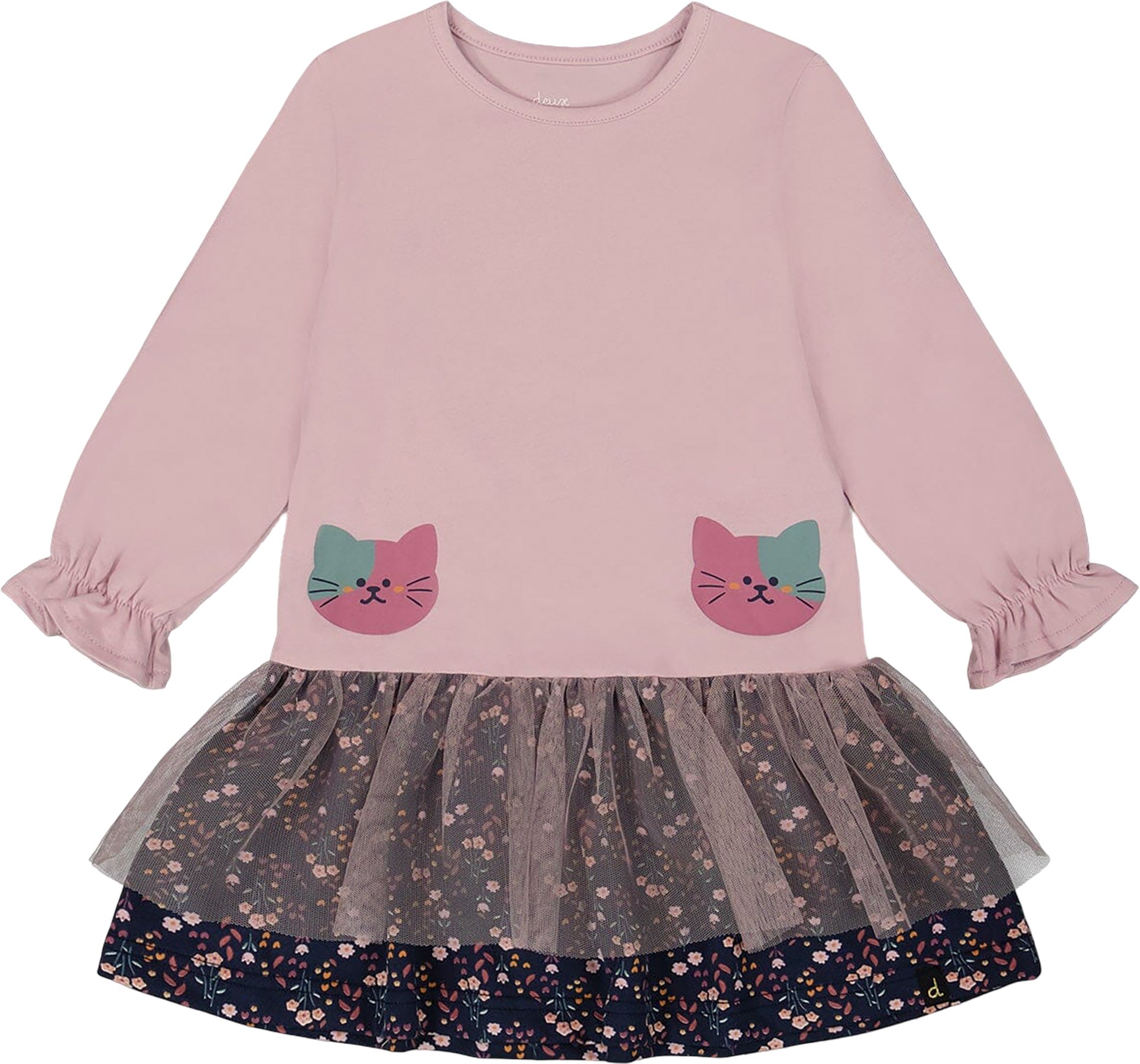 The Bi-Material Dress Dusty Pink is a whimsical mix of soft organic cotton and a playful, flowy skirt. This charming frock, made from organic cotton interlock on the top, fits comfortably, while the skirt features a mesh layer on top of a soft jersey fabric, creating a beautiful layered effect. The round neckline, two adorable printed cats, and puffed sleeves add extra charm and sweetness. With its relaxed fit, this dress is perfect for days filled with imagination, fun, and endless adventures.