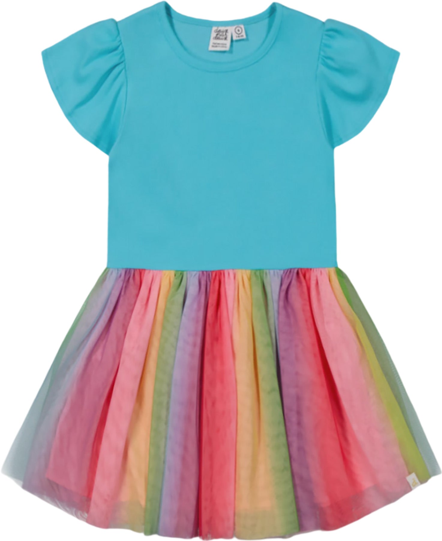 A rainbow mesh overlay adds bold style to our Bi-Material Dress with Printed Mesh Skirt Multicolored! The top features short flutter sleeves, a round neckline, and a small keyhole at the back of the neck. The flared A-line skirt is made from soft, sheer mesh with a vibrant, eye-catching multicolored print.