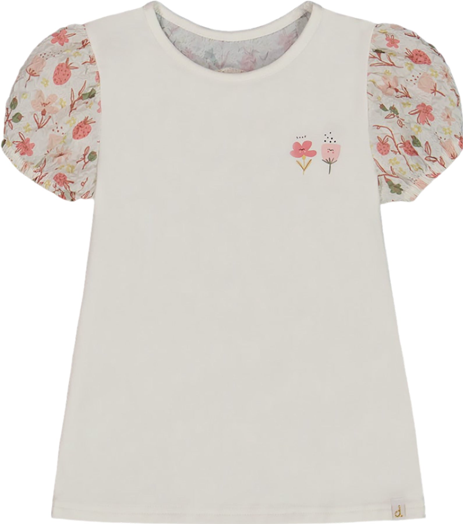 Short puff sleeves and little frills add whimsy and charm to our Bi-Material Organic Cotton Top with Puff Sleeve Pink Flowers on Cream Background. This short sleeve top features printed puff sleeves with elastic binding, a round neckline, and a small graphic print at the left chest. A cut out back with little frills make it simply adorable from every angle.