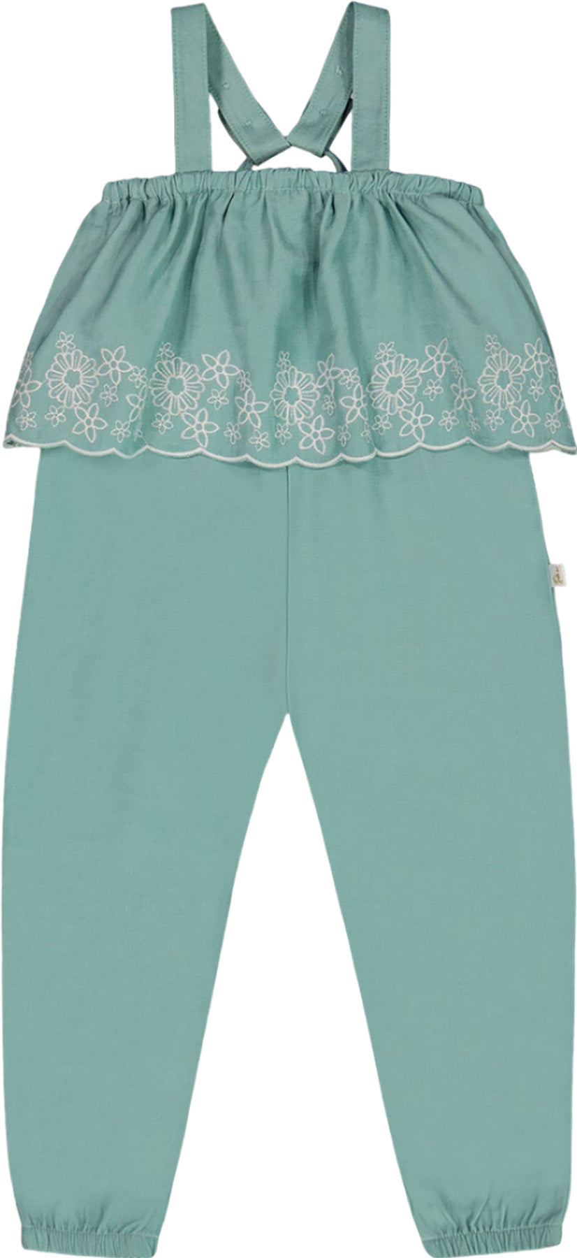 Features • Sleeveless jumpsuit • Ruffle overlay • Embroidered flowers • From 12 months to 8 years