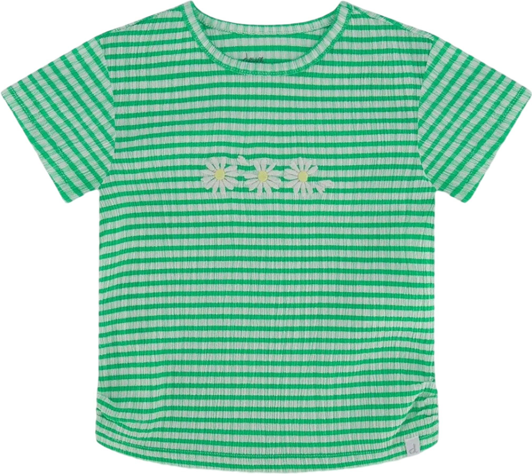 An allover plaid pattern and a crinkle texture lend bold personality to this cute, comfy tee! The Crinkle Jersey Top With Flower Applique features short sleeves, a round neckline and shirred sides. A large daisy applique on the chest adds the perfect finishing touch.
