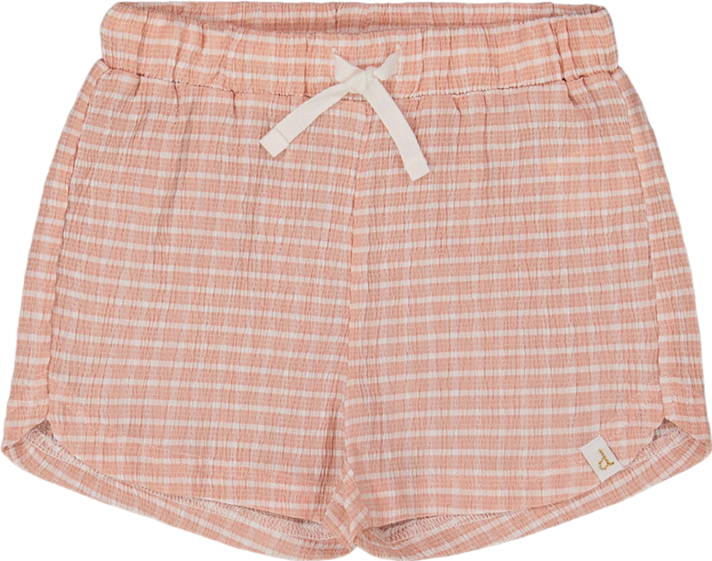 Features • Drawstring waist shorts • Curved dolphin hem • Two-tone check pattern