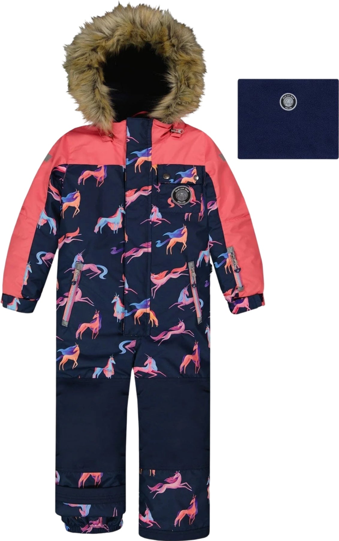 Our One Piece Snowsuit is a smart and stylish choice for a day of playing in the snow! This weather-resistant snowsuit is insulated for warmth in frigid temps and detailed with a removable hood with faux fur trim, articulated knees and sleeves that make it super comfortable to wear and an inside adjustable waist so you can get the perfect fit. We've added reflective accents, a D-ring for mittens and multiple pockets for added function and even more distinctive style!