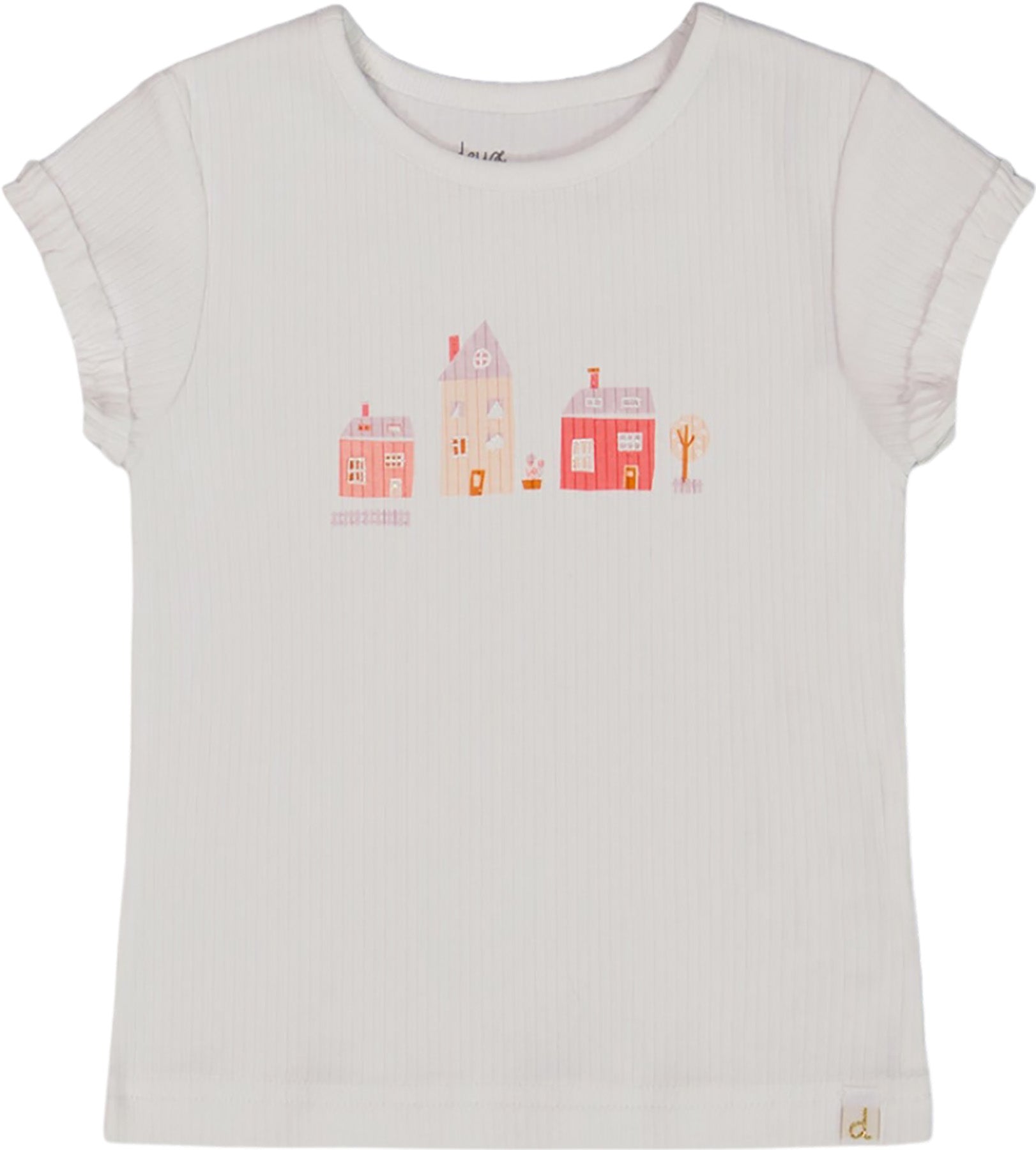 Vertical ribbing adds subtle texture to our Flat Back Rib Top with Print White and Pink House. Oh-so-soft and comfy to wear, this versatile tee features a short sleeve silhouette in stretch cotton with a round neckline, gathered elastic sleeves, and a graphic house print on the chest. It coordinates perfectly with any bottom in our Home Sweet Home collection!