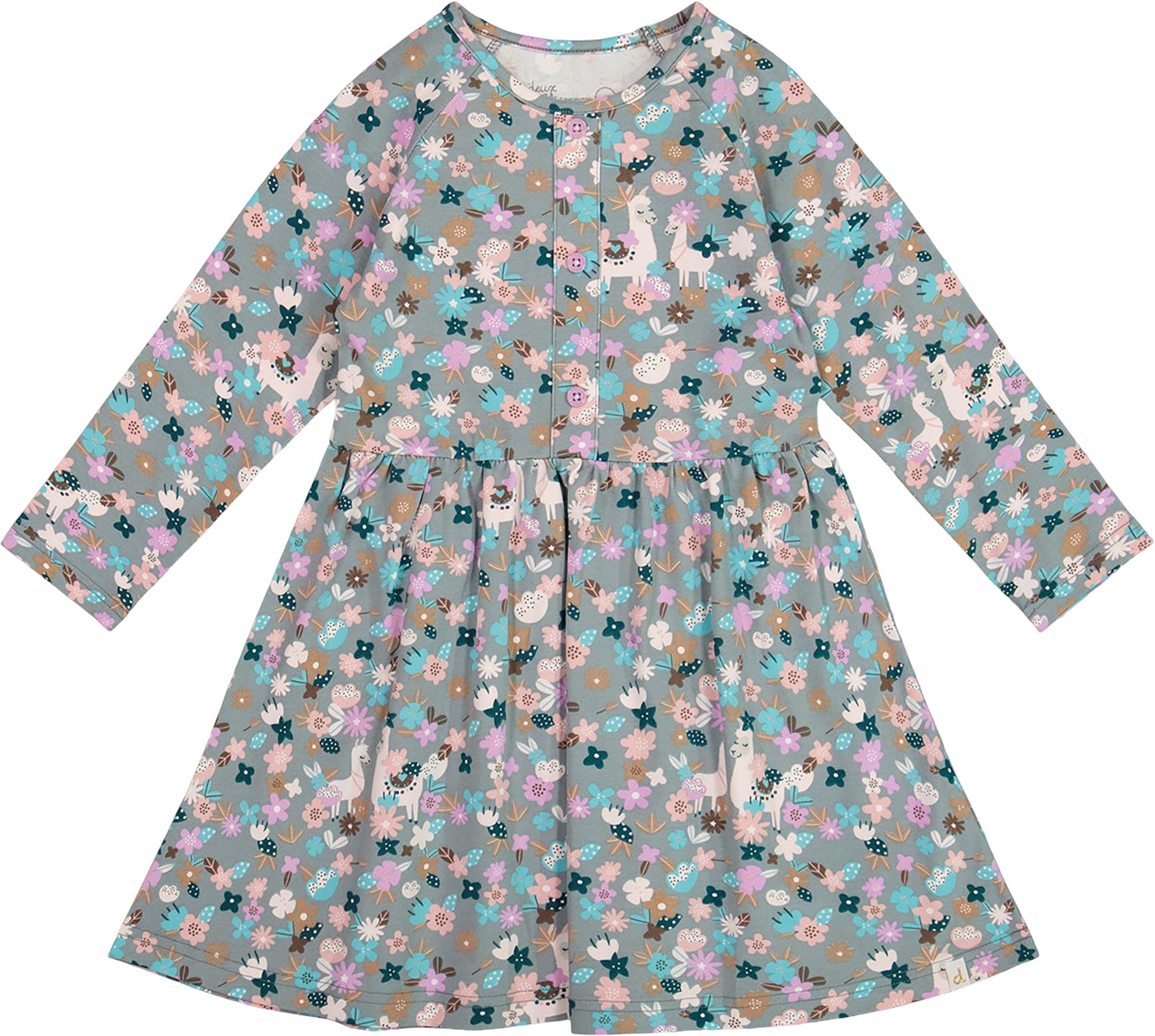 Our Half Button Organic Cotton Dress in Blue With Llama Print blends softness and whimsy for everyday adventures. Crafted in stretchy organic cotton jersey, this dress features a cute allover print of llamas and flowers, long raglan sleeves, a round neckline, and a front button placket that stops at the waist. The flared silhouette adds playful movement, perfect for school days and weekend outings.