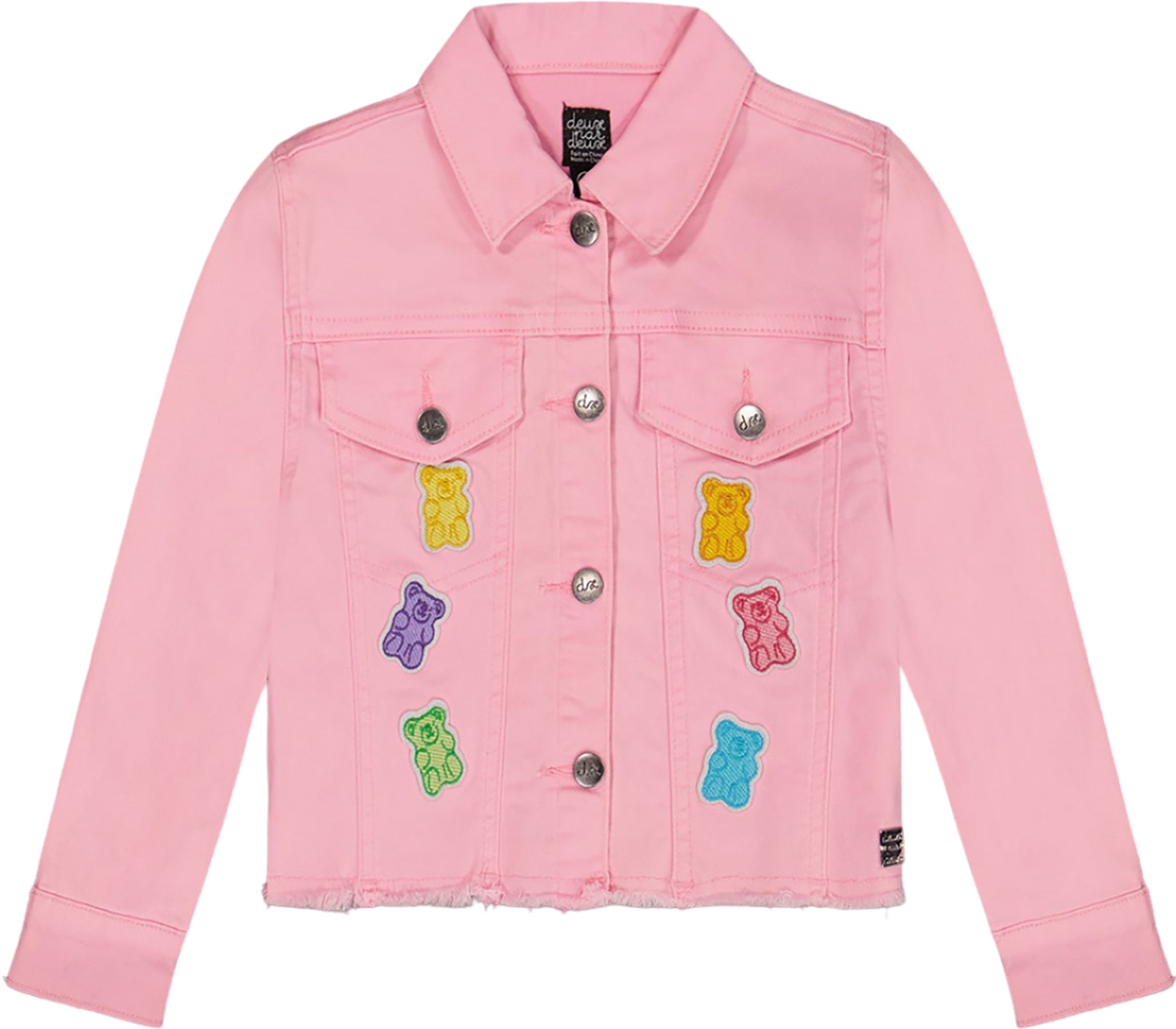 Add the perfect finishing touch to any outfit in our Candy Lane collection with our Jean Jacket with Embroidery Pink and Multicolored Gummies. In stretch cotton/poly denim, this jacket features a classic silhouette with long sleeves, front buttons, and flap front pockets. A frayed hem and multicolored gummy bear appliques make it oh-so-playful!
