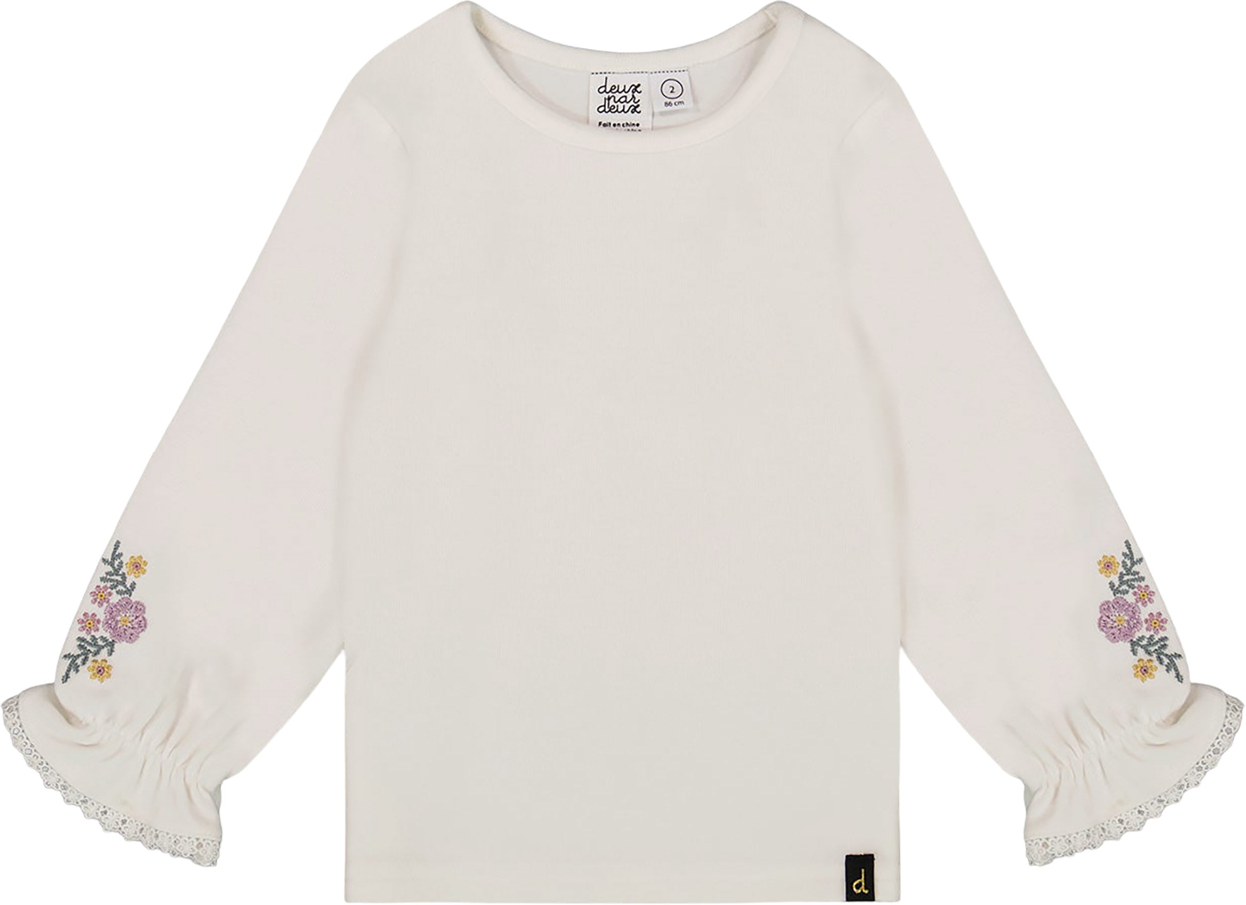 This Jersey Top in Off-White With Embroidered Floral Sleeves brings elegance to everyday wear with delicate stitched flowers. The long-sleeve tee features a rounded neckline, soft jersey fabric, and flared sleeves finished with ruffled cuffs and a subtle lace trim. This blouse is perfect for adding a romantic twist to your baby girl’s fall wardrobe.