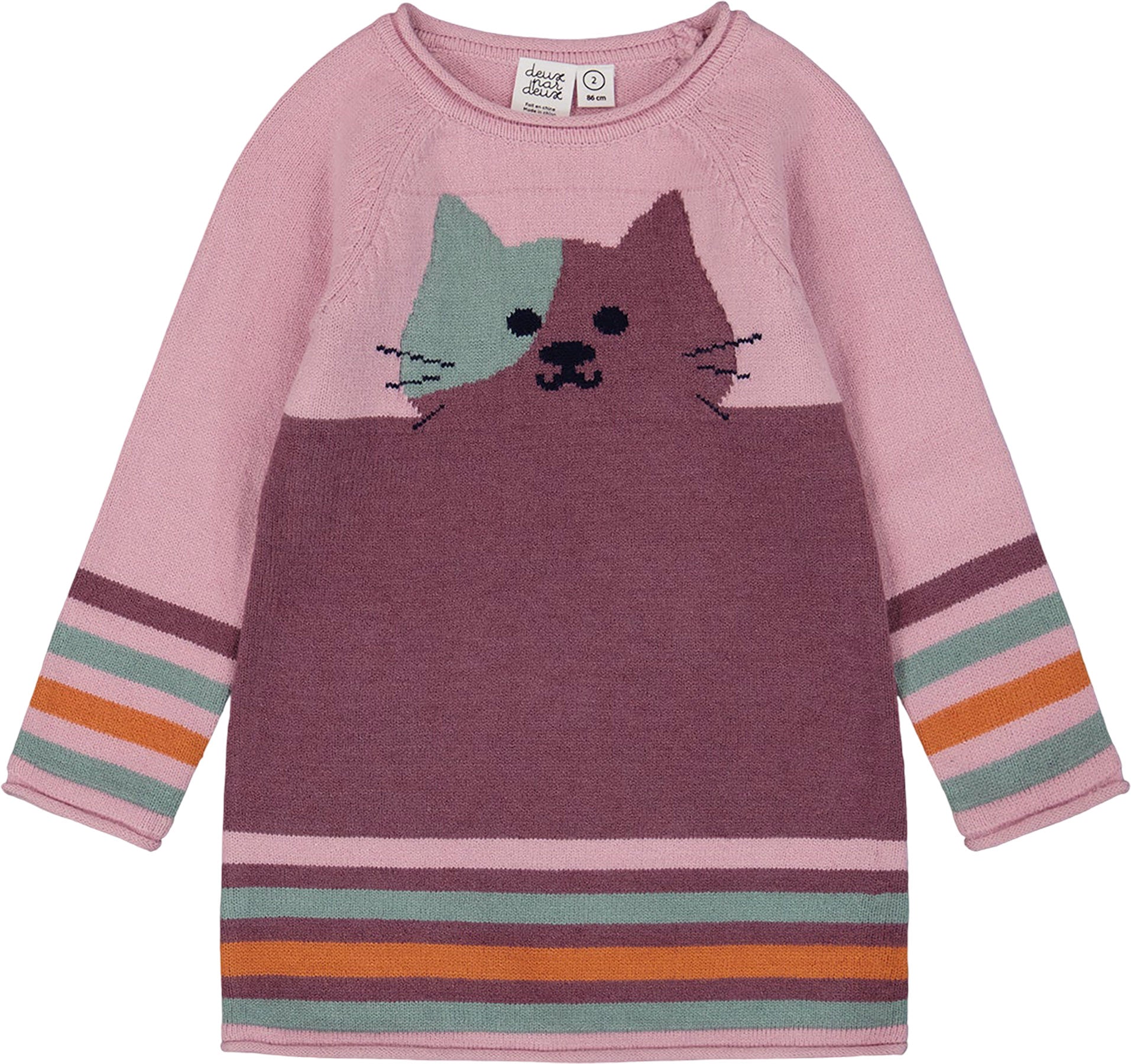 This Knitted Dress Dusty Pink With cat is a charming and cozy option, combining comfort and style. Crafted from a soft blend of viscose, polyester, and nylon, this frock features a delightful cat design woven into the knit jacquard pattern. With its raglan sleeves, round neckline, playful and colorful stripes, and relaxed fit, this dress is perfect for cooler days, ensuring she stays warm and stylish while exploring the world around her.