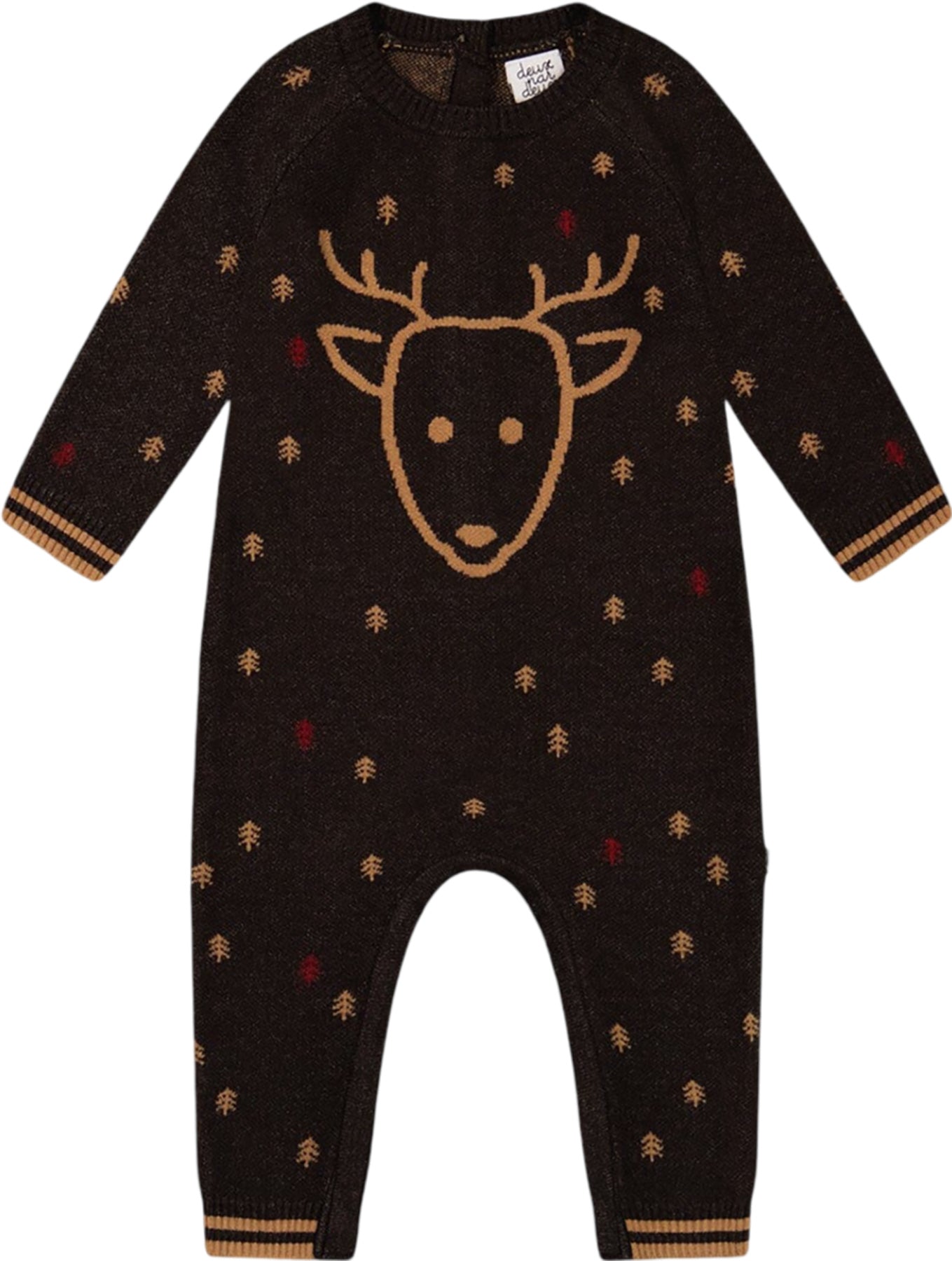 Allover trees and a large reindeer head add one-of-a-kind style to our Knitted Jumpsuit with Intarsia Reindeer. This sweater jumpsuit features long raglan sleeves, a round neckline and contrast tipping at the neck, cuffs and ankles. It's a sweet and stylish choice for a holiday party or any cold weather gathering with family and friends!