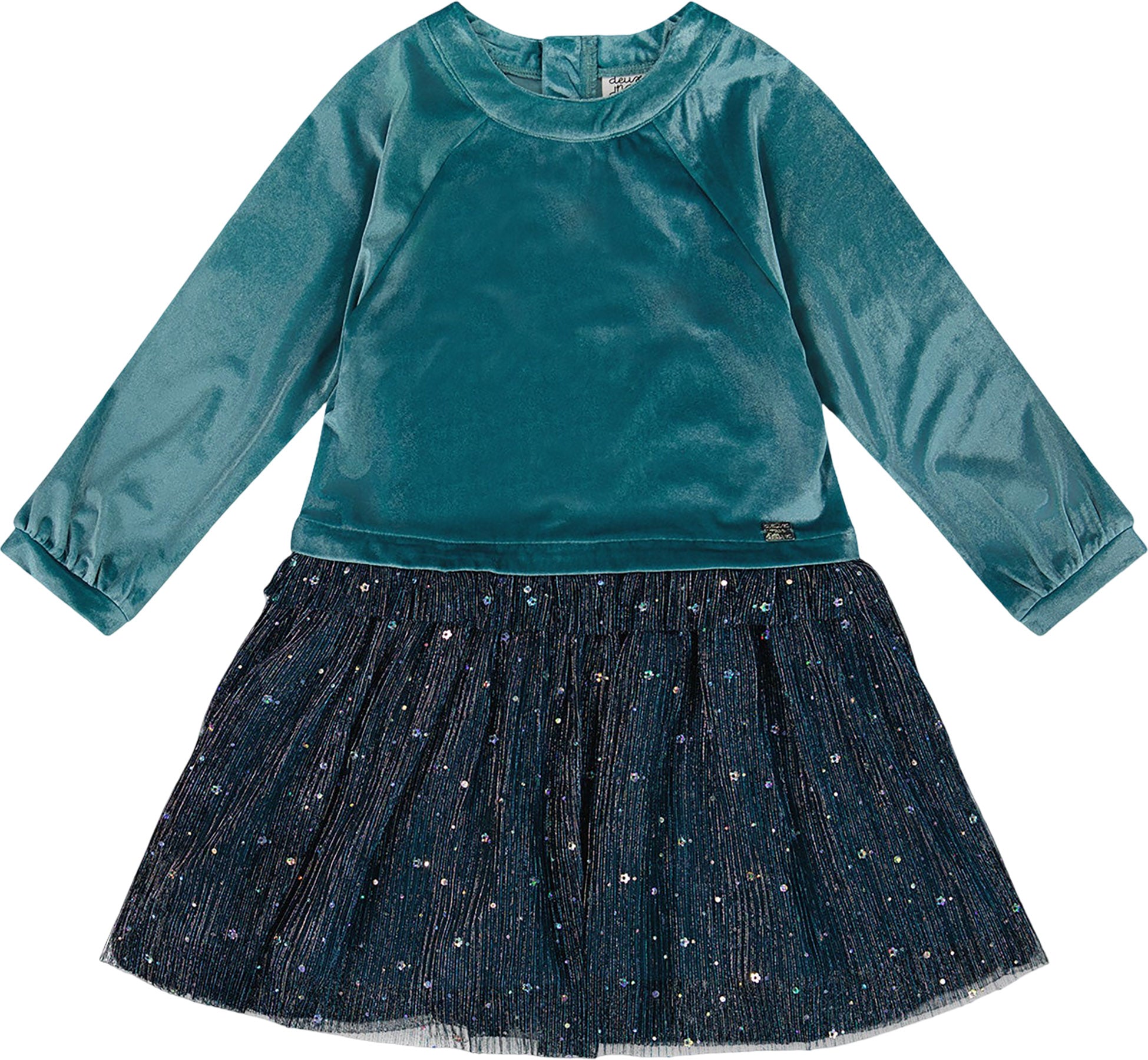 Long Sleeve Bi-Material Velvet and Pleated Mesh Dress - Big Girl