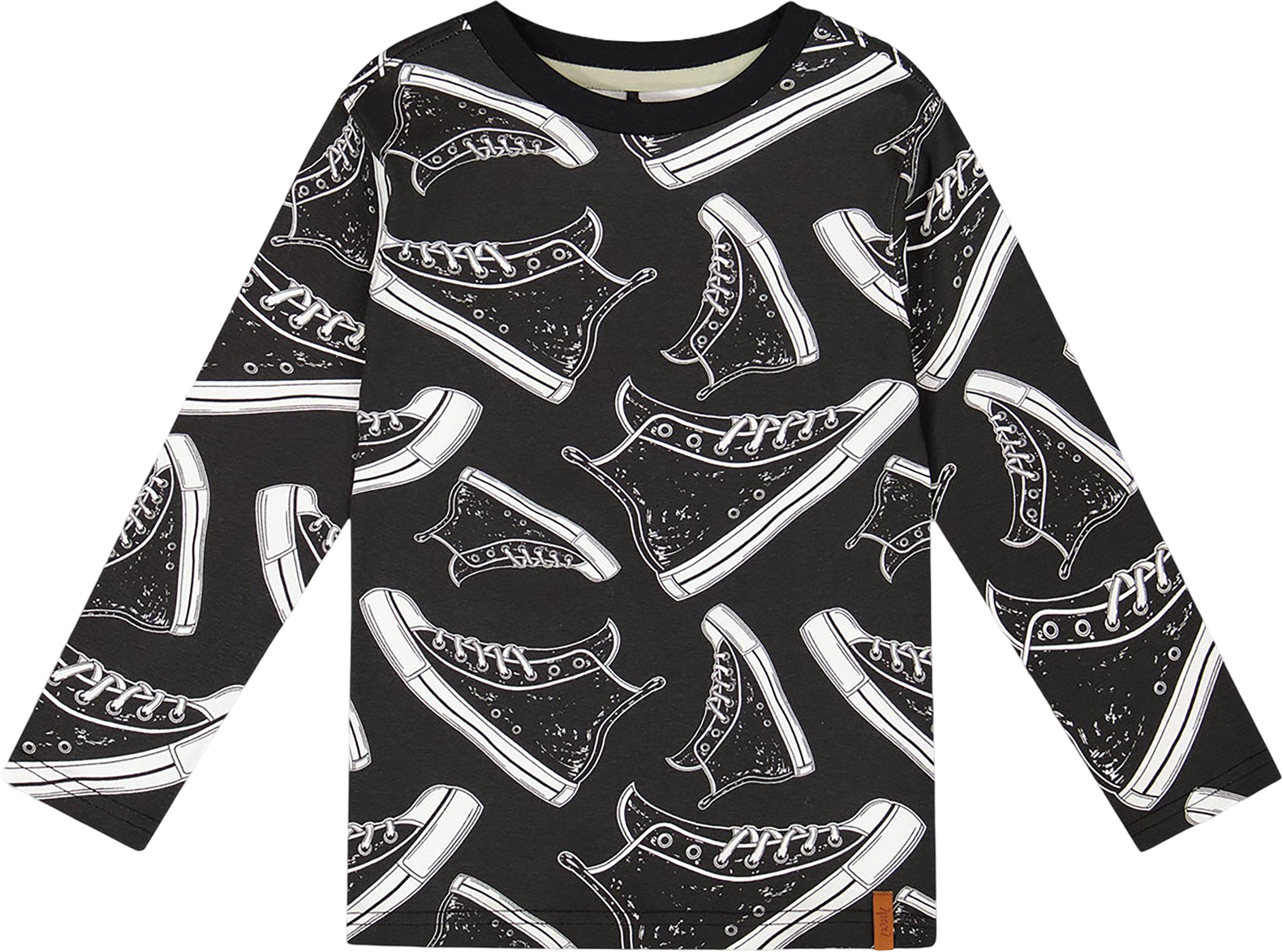 A graphic high-top sneaker print makes this top a must-have for the boy with an edgy sense of style. In ultra-soft organic cotton jersey, this tee features long sleeves, a comfortable crew neckline, and a bold allover print with a small logo label at the hem.