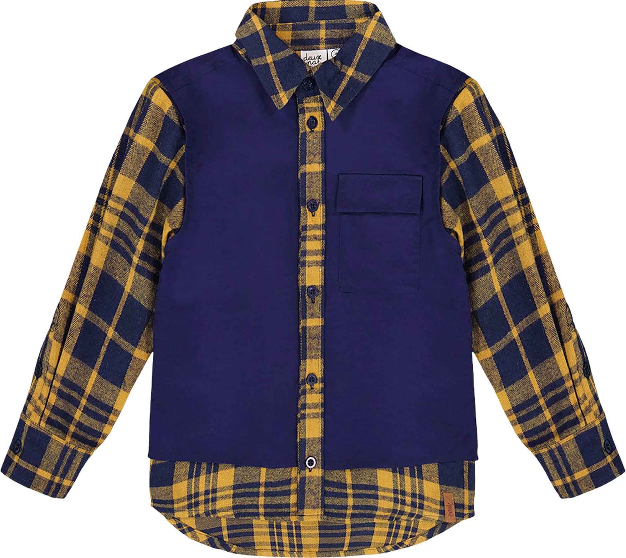 Enjoy a layered look without having to layer at all with this plaid flannel top and faux vest combo. In soft and cozy flannel fabric, this shirt features a versatile button down silhouette with long sleeves, buttoned cuffs, a collar, and a flap pocket on the chest. A solid vest layer creates the illusion that he's wearing two pieces instead of one.
