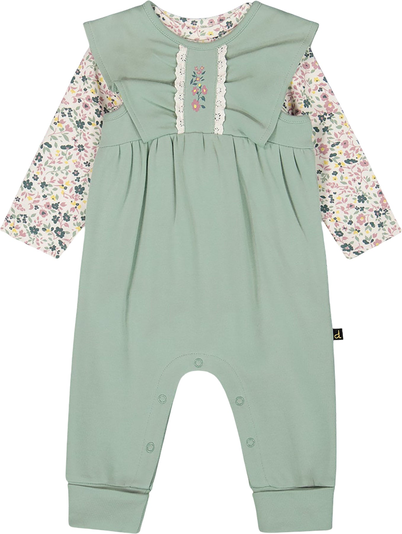 Soft and stretchy, our Organic Cotton Bodysuit and Sleeveless Overalls Set Jade Green is made for all-day comfort. The onesie features long sleeves and convenient bottom snap closures, making dressing a breeze. Paired with a cozy sleeveless interlock overalls with folded cuffs at the legs, this set is perfect for cuddles, playtime, and tiny adventures.