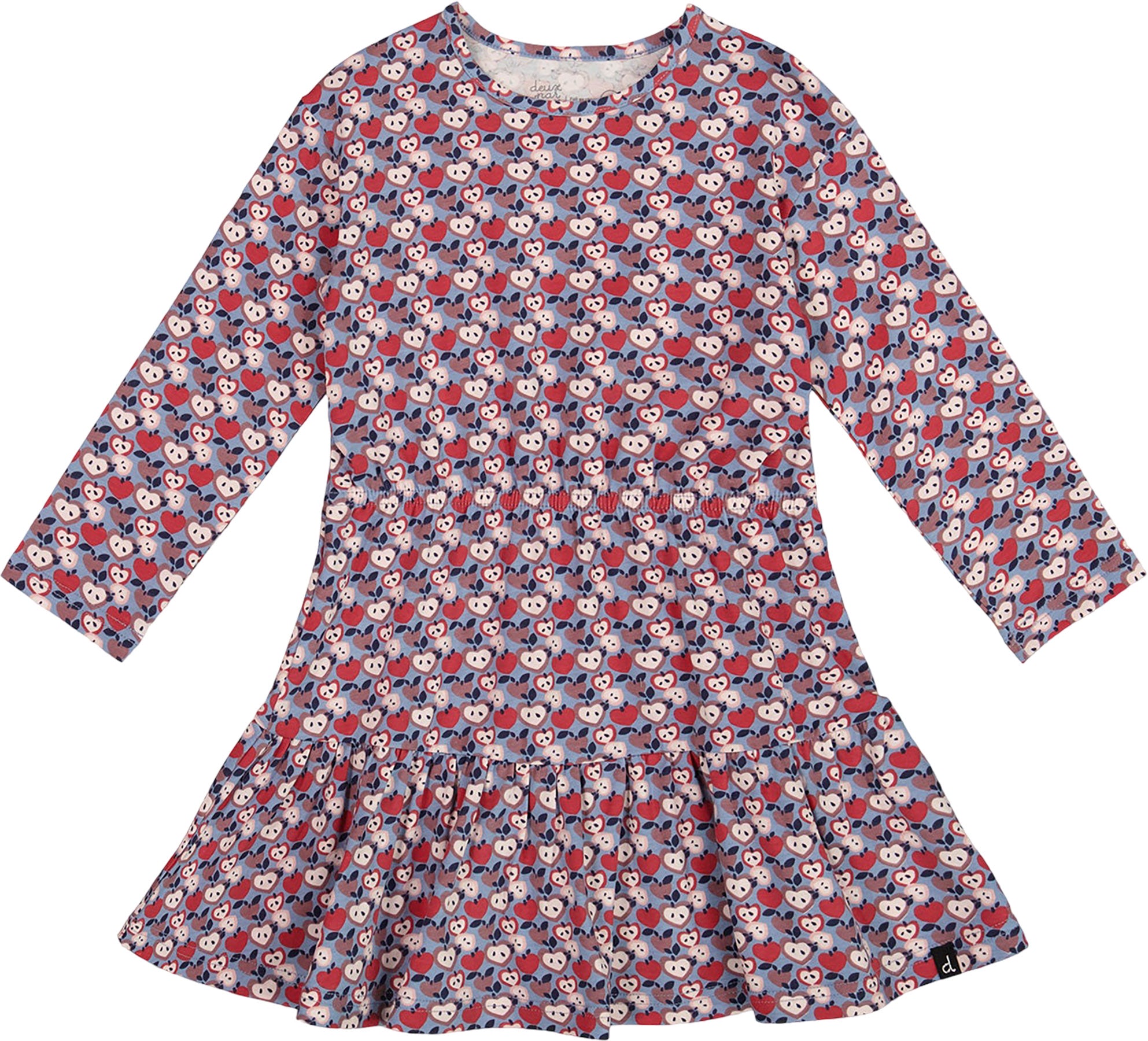 Fresh and playful, the Organic Cotton Dress With Flounce Hem Blue Apple Print is a feel-good favorite for young girls this fall. This long-sleeve jersey dress features a round neckline, a gathered waist, and a flounce hem, all covered in a cheerful allover apple print in soft blue, red, and white tones. Made from stretchy organic cotton jersey, it’s comfy enough for school days and cute enough for special outings.