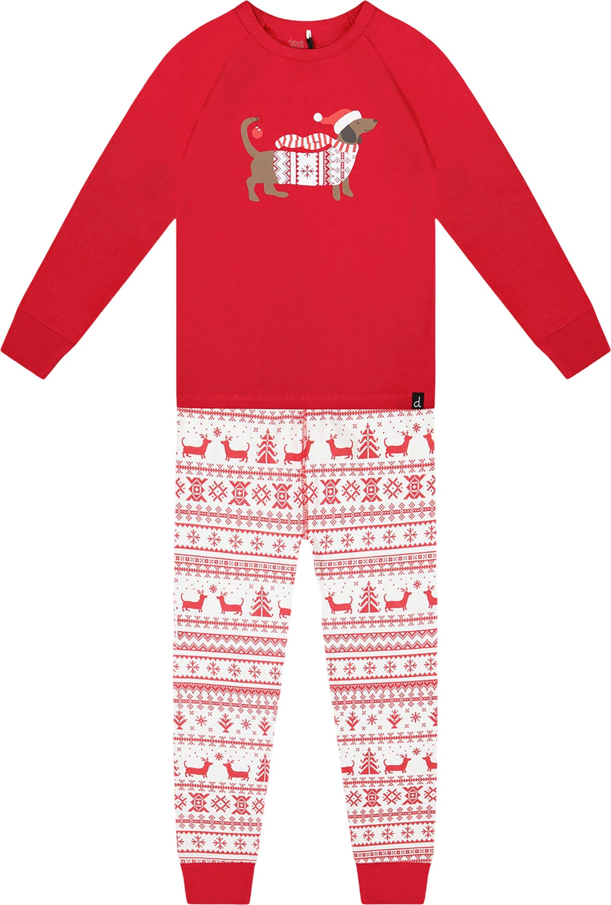 Coordinate the entire family together with our red and white Christmas Morning pajamas! This sleepwear set is made from ultra-soft organic cotton and features a long raglan sleeve top with a round neckline, a reindeer graphic print on the chest, and an allover fairisle print pant with a stretch elastic waistband.