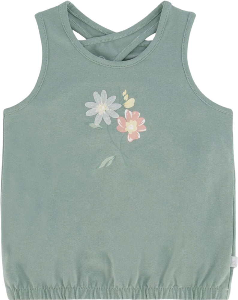 Our Organic Cotton Tank Top With Print Olive Green is simply darling from front to back! This soft jersey tank features a scoop neckline, a gathered elastic hem and wide straps that crisscross in back to create an open keyhole. It's finished with a pretty floral print on the chest.