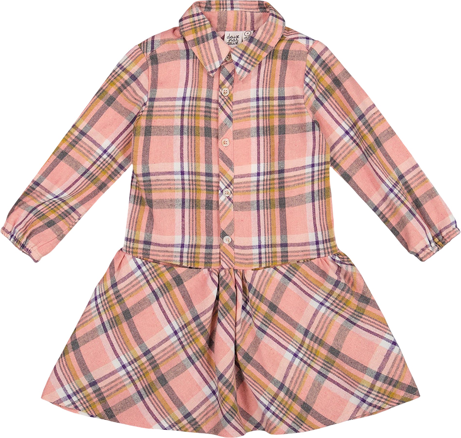 Our Shirt Plaid Dress With Frill Pink, Yellow and Gray blends timeless charm with a playful silhouette. Made from soft 100% cotton flannel, this plaid dress features a pointed collar, front button closure, long sleeves with elastic cuffs, and a drop-waist frill that adds volume to the skirt. Soft and stylish, it’s perfect for girls who love a classic look with a twist.