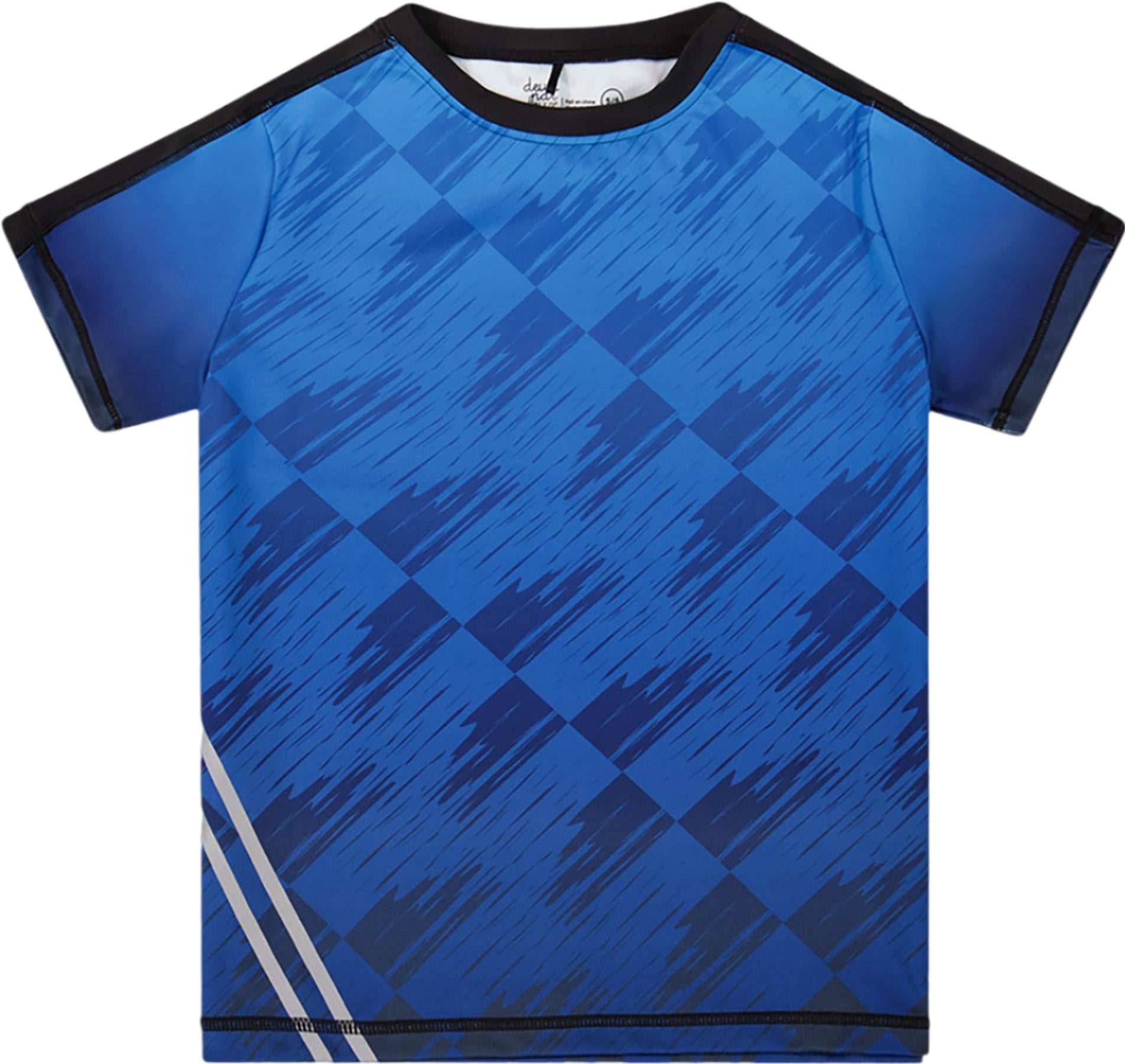 Whether he's playing organized sports or just running around the yard, our Printed Athletic Top Blue and Black offers ultimate comfort and cool, sporty style! This top is made from recycled poly fabric and features short sleeves with contrast stripes, a round neckline, and an allover print with diagonal graphic stripes.