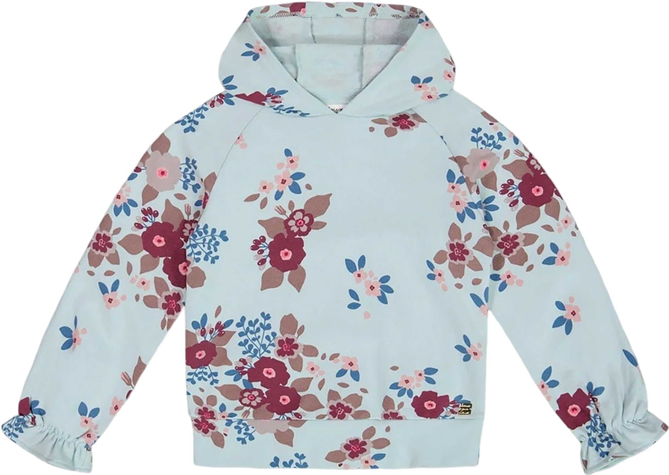 Flared ruffle cuffs and a large floral print add extra-girly charm to our Fleece Hoodie Light Blue Printed Big Flowers. This comfy hoodie is made from soft stretch cotton fleece and features a pullover silhouette with long raglan sleeves, elastic gathering at each wrist and a bold allover print. Team it with a matching pant for head to toe coordination!