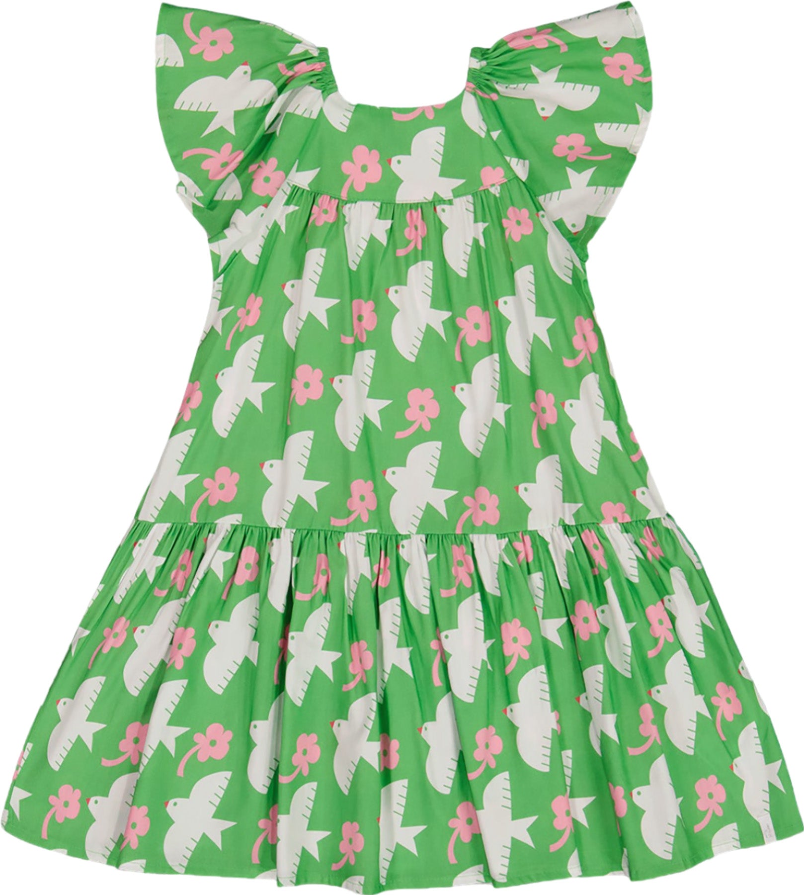 Flutter sleeves and an A-line shape make our Printed Dress with Flounce Sleeves Green with White and Pink Bird a colorful and comfortable addition to any little girl's wardrobe. This casual dress features short sleeves, a round neckline, and a drop waist silhouette with a fun flounce hem.