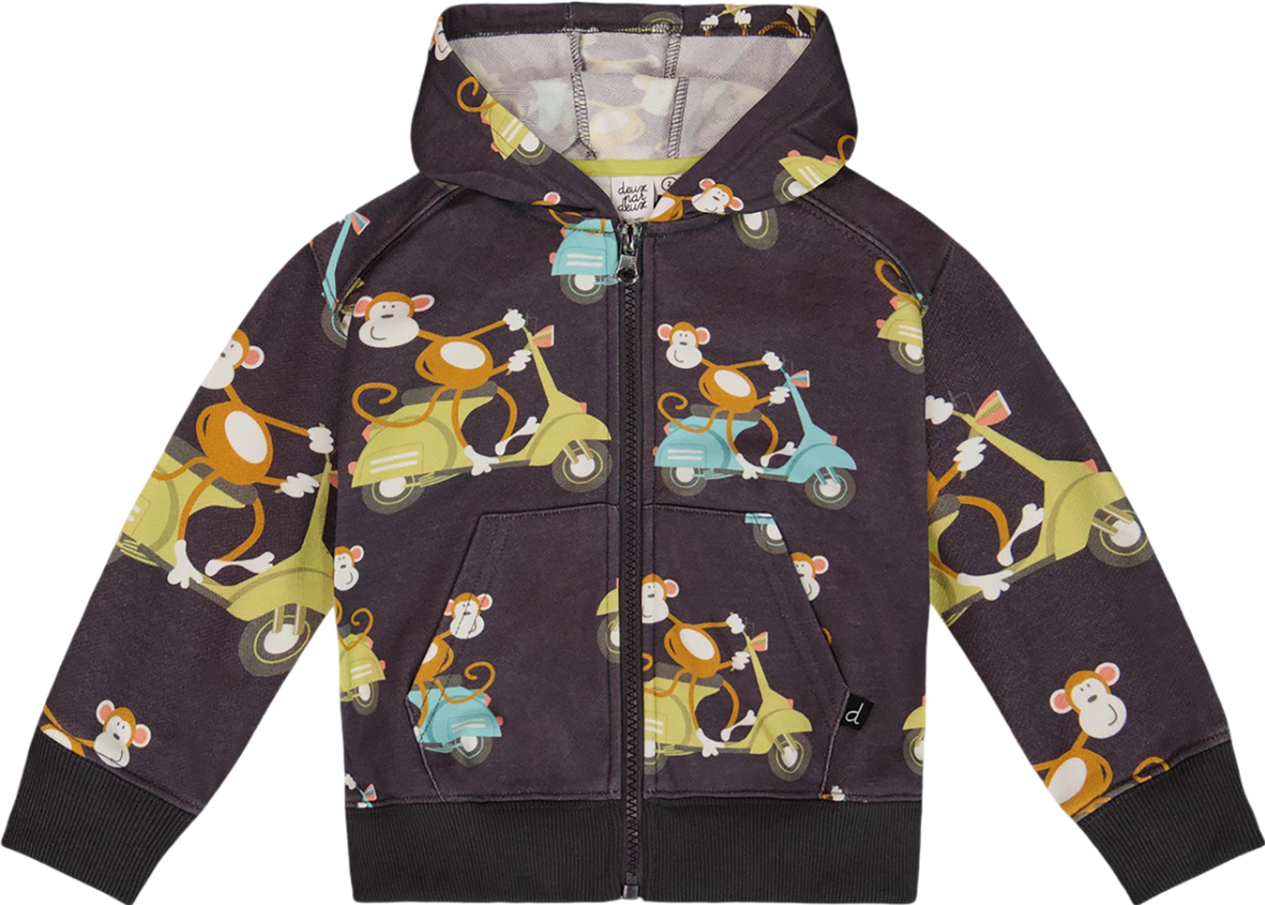 It doesn't get any cuter than our Printed French Terry Hooded Full Zip Cardigan Sweatshirt Monkey on Navy Moped. Perfect for chilly spring and summer nights, this adorable hoodie features long sleeves, a zip front closure, solid rib knit trim at the cuffs and hem, and a vibrant allover print. Team with a matching short for a cool, coordinated look!